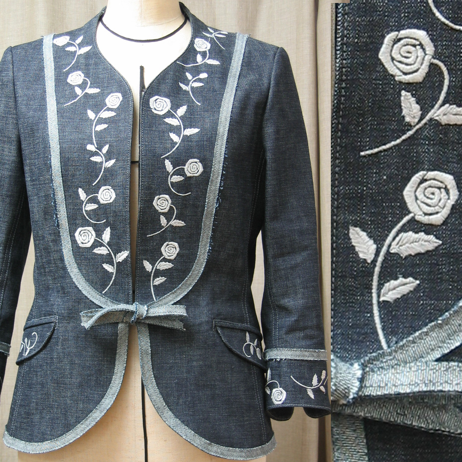 バラの刺繍を施したデニム生地のジャケットは、切り替え線のところに生地の裏面を用いてメリハリを持たせ、その裏側の生地をリボンとしても活用しました。