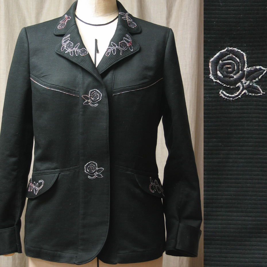 バラを各所に配置し、刺繍糸を生地の色と同色にすると、モチーフの背景に照明が当たっているような効果が。
