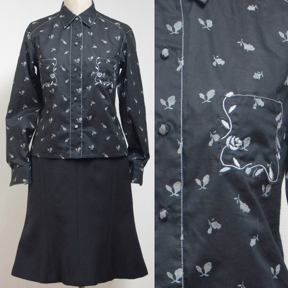 このブラウスは、コンピュータ刺繍ミシンで「バラ」の図案を作り、その図案を複数組み合わせて、ポケットを縁取るように身頃に取り付けました。