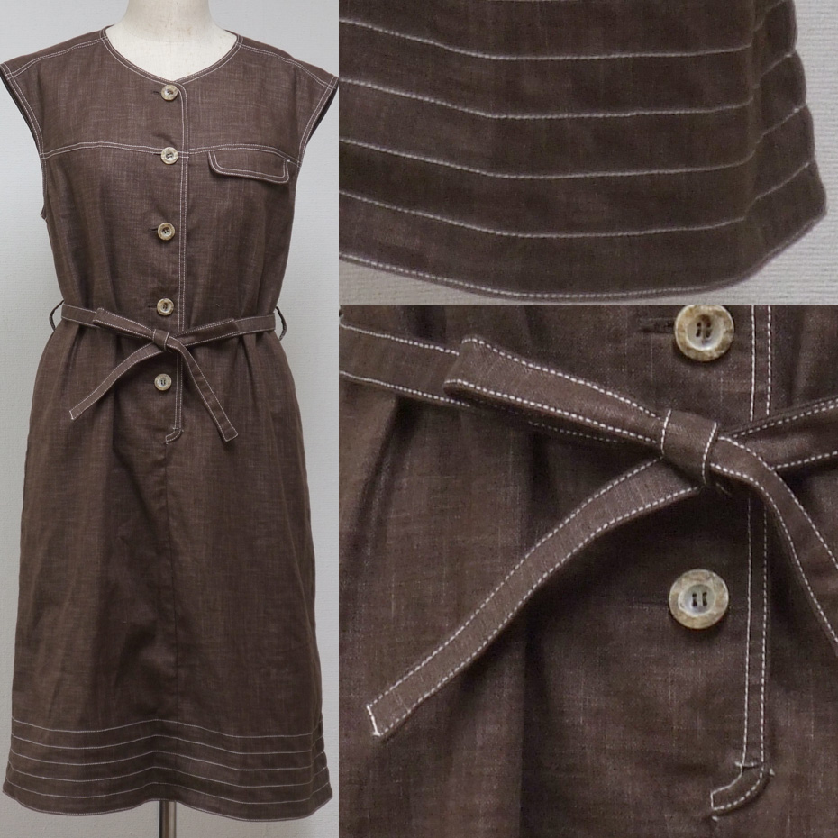 茶色の綿生地の各所に、白いステッチをきかせることによって、涼しさを演出したワンピース・ジャンバースカートは、このままノースリーブで着るのではなく、中に半袖Tシャツなどを着ることを想定しているため、袖ぐりを低めに作りました。