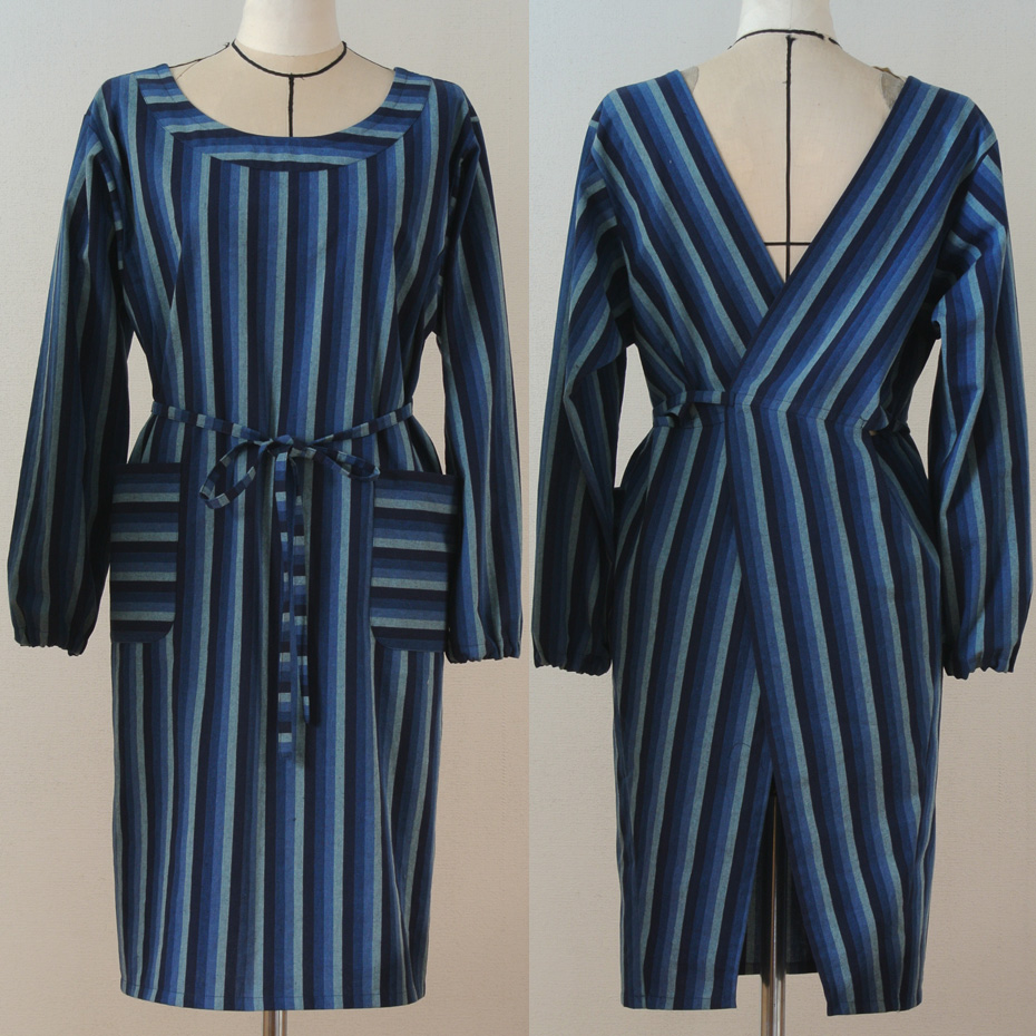 これは、「エプロン」になるのでしょうか?、やはり「割烹着」?ストライプの生地を縦横斜めに組み合わせてみました。