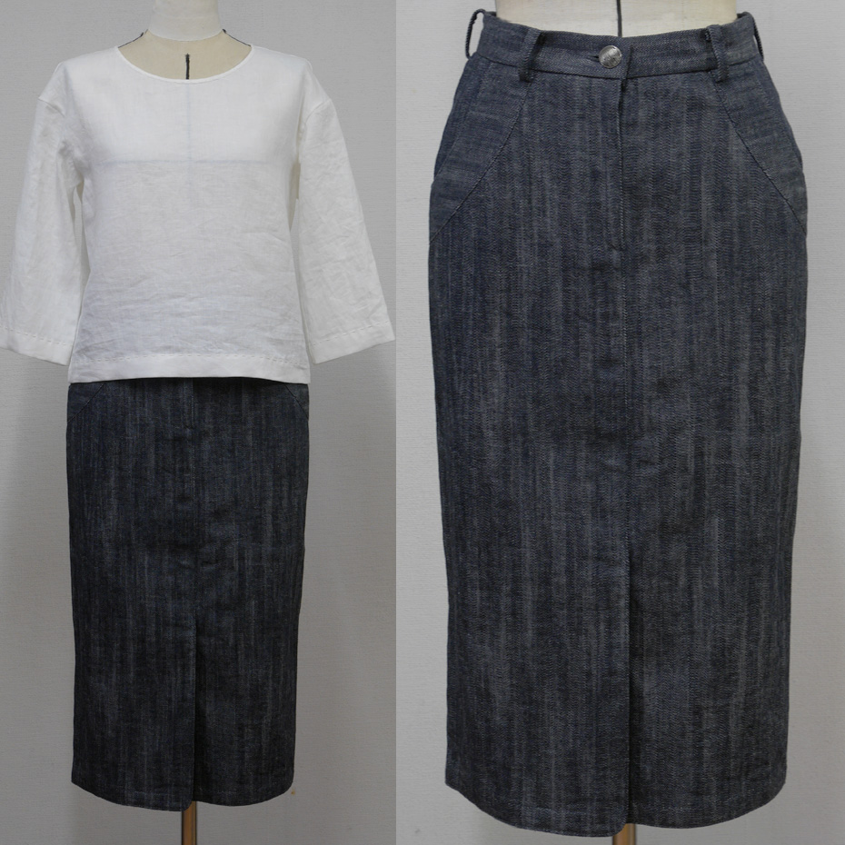 麻のブラウスと、デニムのタイトスカートという、シンプルでオーソドックスな組み合わせの中に様々な工夫があります。