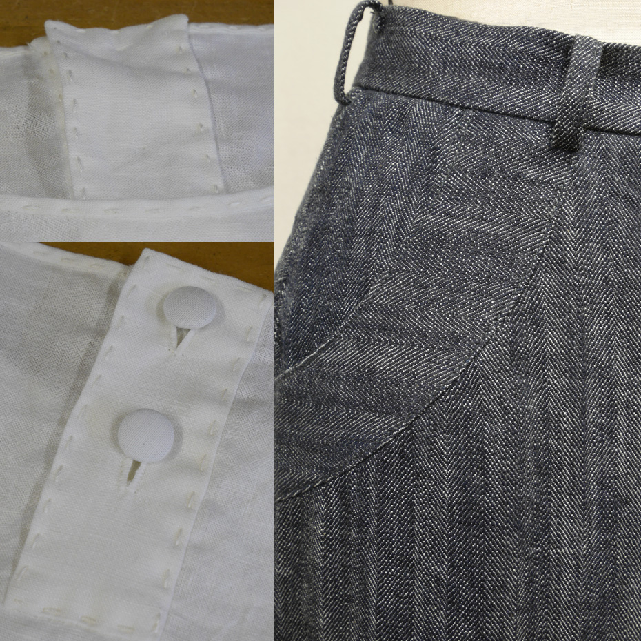 ブラウスは、衿ぐりは限界まで細くしたパイピングにハンドステッチを施し、その他の箇所のハンドステッチを施すことによって、さりげなく手仕事の味わいを。