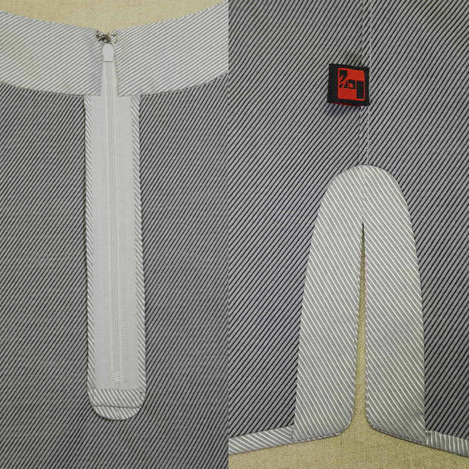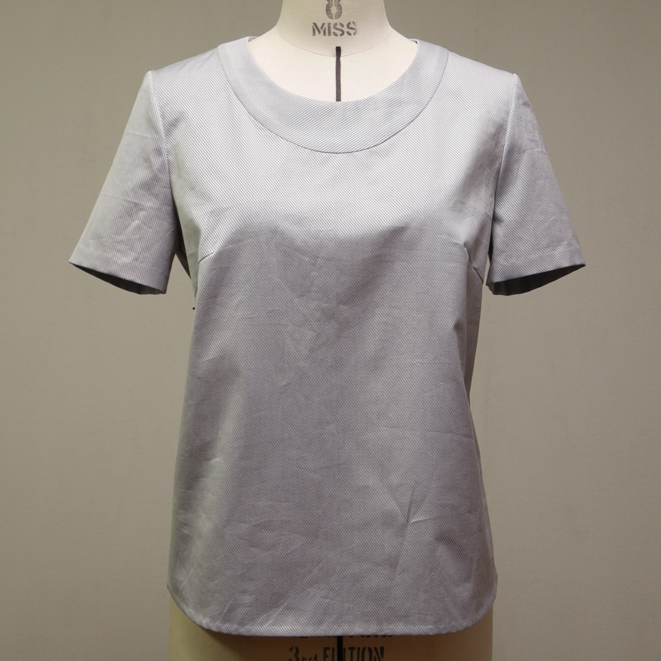 このブラウス、裾のラインなど、シルエットにはこだわりましたが、生地の良さを活かすために、襟の切り換えのみの、シンプルなデザイン。