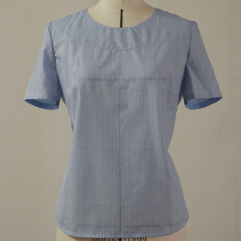 このブラウスも、前身頃分と袖が取れるか取れないかの、イビツな形の生地で、前身頃は、ストライプの生地を活かすような切り替えに、後ろ身頃は水色の他の生地を調達して制作しました。