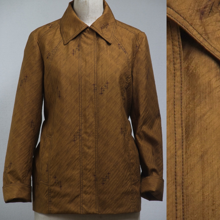 茶色のステッチをさりげなく施し、あとはボタンも隠し、シンプルに仕上げた着物リメイクジャケットです。