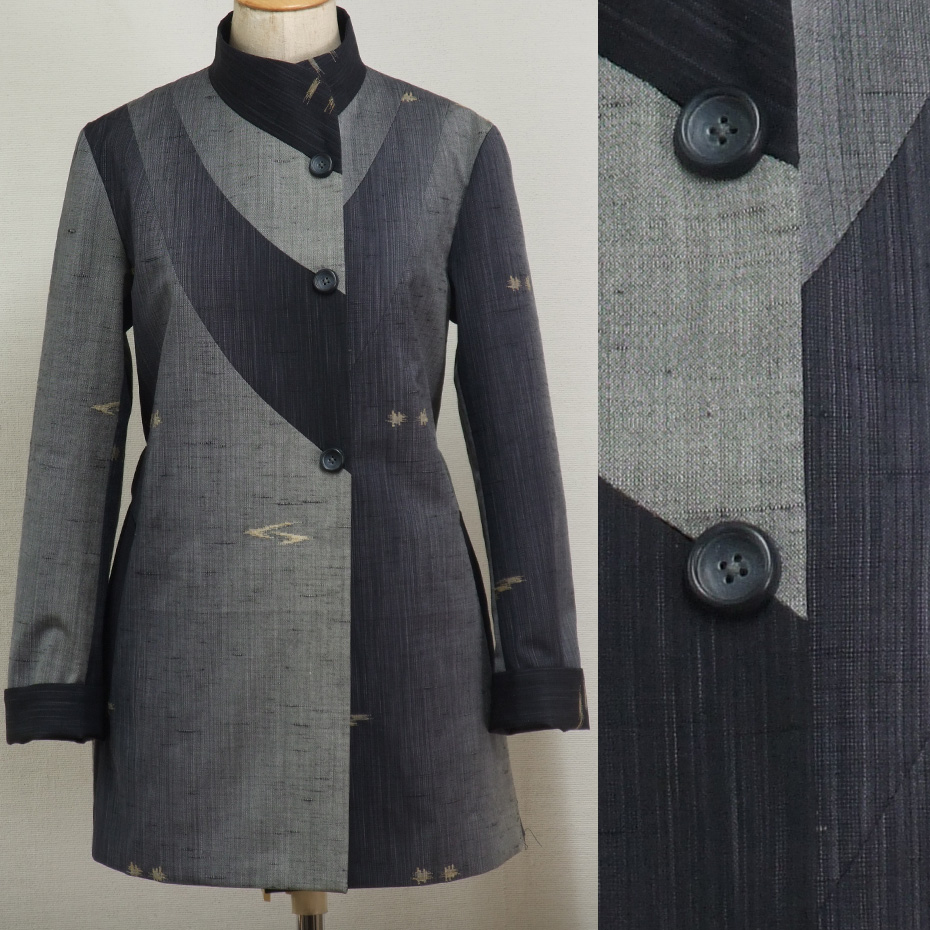 生地の状態では左右がグラデーションになっていて、着物のときは単純に一方方向に色が流れていましたが、グラデーションの特徴を切り替え線として利用した、着物リメイクジャケットです。