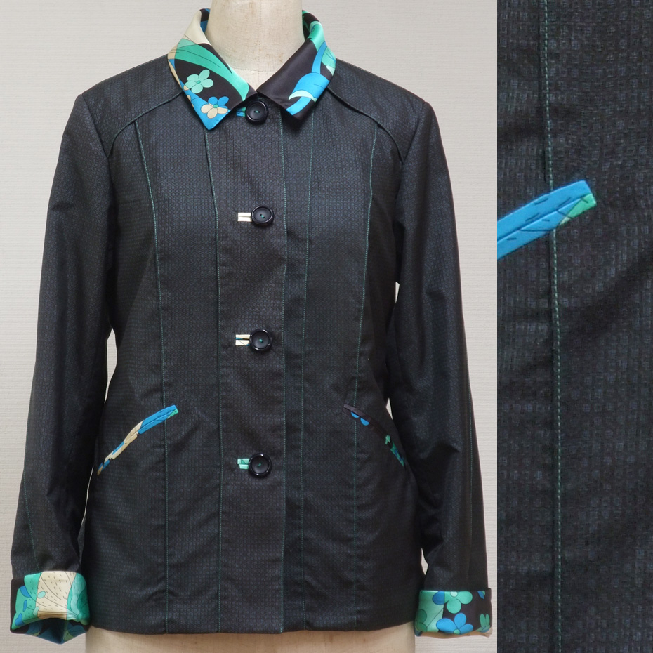 衿、ポケット、ボタンホール、袖口にプリントの洋服地を組み合わせた、着物リメイクジャケット。