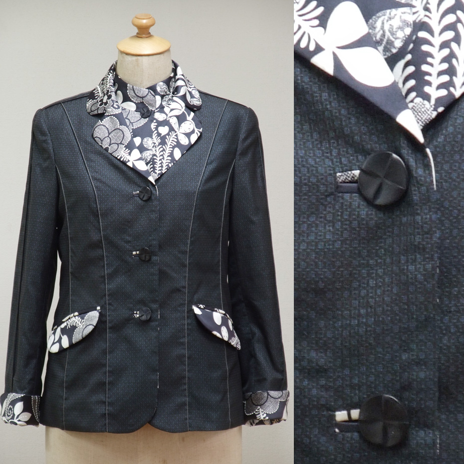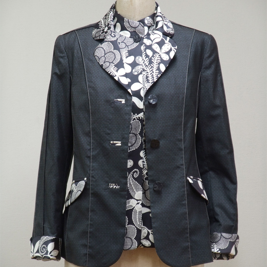 洋服のシルク地を組み合わせた、着物リメイクジャケットとブラウスのコンビネーション。