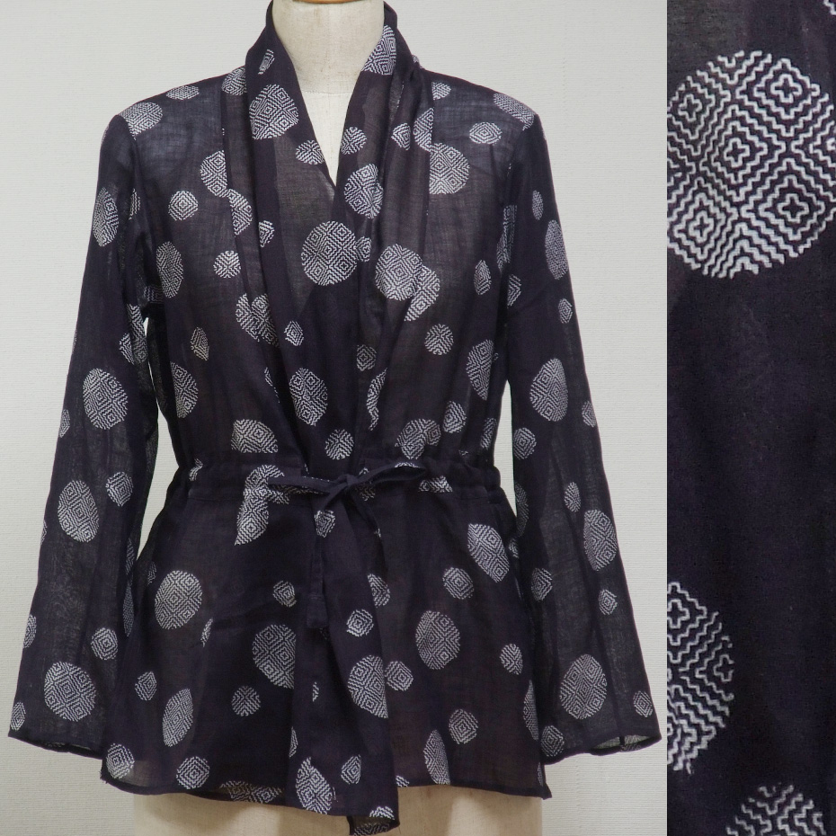 裏地も見返しもなく一枚きりで仕立てられ、まるで夏物ストールのような着こなしができる着物リメイクジャケットは、ストレートな身頃のシルエットを、ウェストに備えつけられた紐でしばることで、やわらかなシルエットをさりげなく作り出しています。