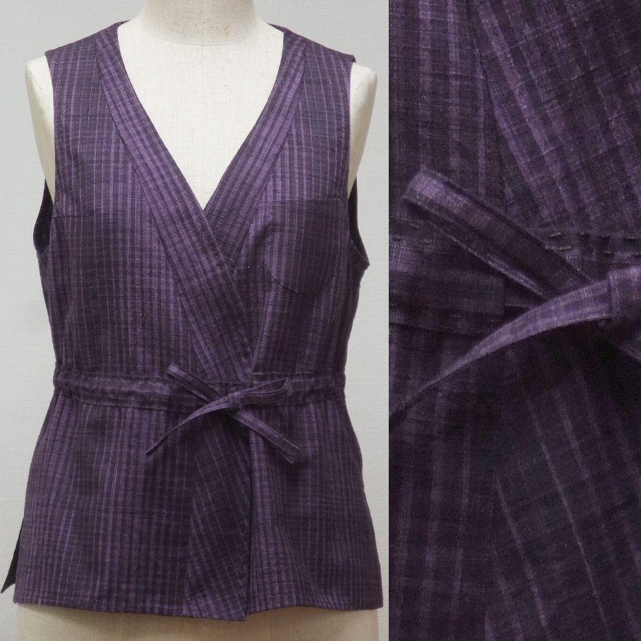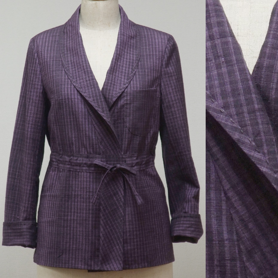 この、見返しもない一重仕立ての、とても軽いジャケットとベストの着物リメイクのアンサンブルは、縦縞が強調される着物地を縦、横、斜めと使い分け、、ただ直接的に仕立てられた身頃を、同じ生地で作られたヒモでしばることで、ほっそりとしたシルエットになるようにしました。