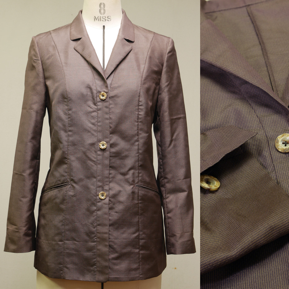 この着物リメイクジャケットは、玉ぶちのボタンホールとポケットが、通常のものと比べて半分くらいの幅になっていたり、袖くりにまで至る袋縫いの幅が4mmと、かなり細くなっています。