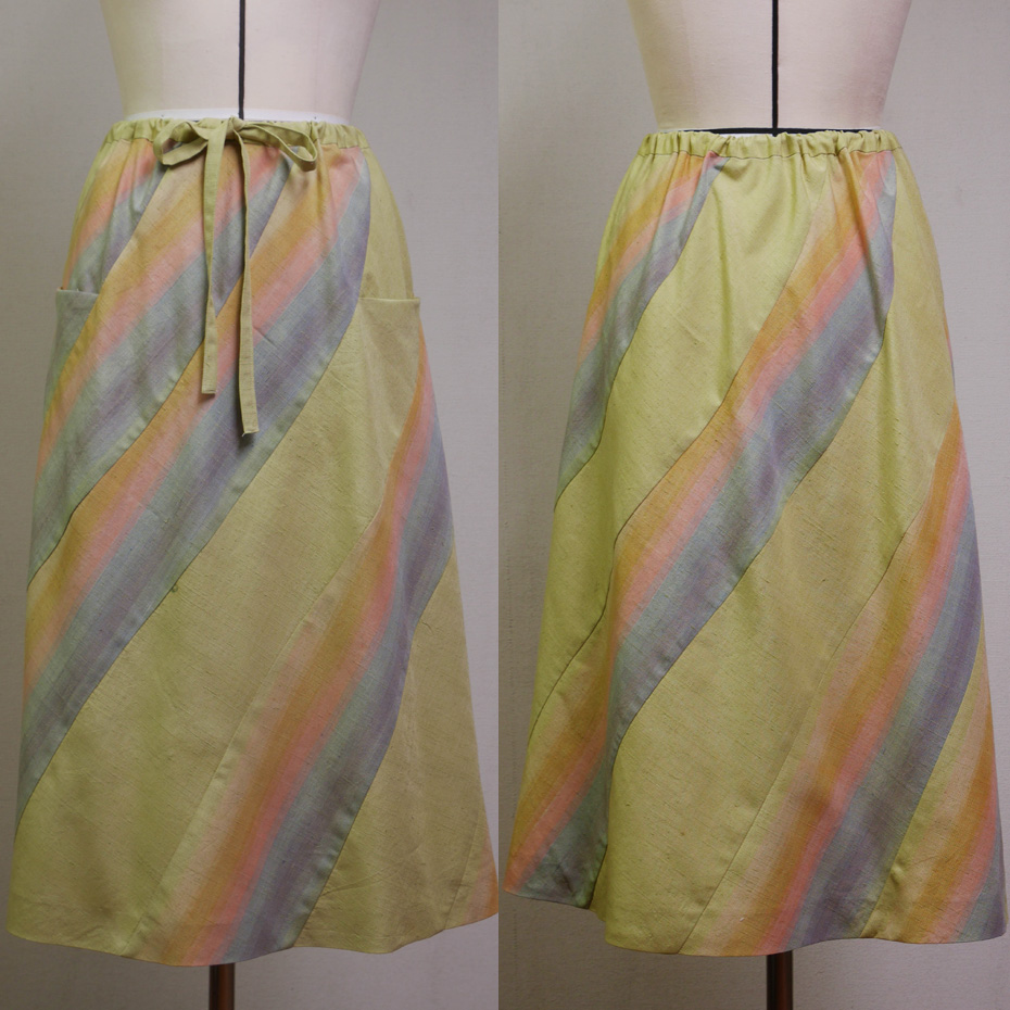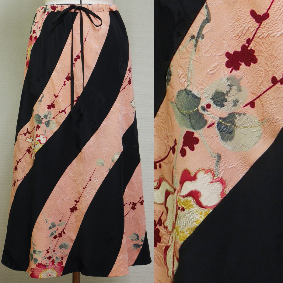 「誰でも簡単に作れる」をテーマにした着物リメイクスカートは、着物地の半分の幅17cm×100~110cmの生地が8枚、S字型の一種類の型紙からできていて、(下のスカートはポケットがあるので少し違います)あとはウェストベルト部分と、ヒモの生地(既成のヒモでも、ゴムでも大丈夫です)があれば完成です。