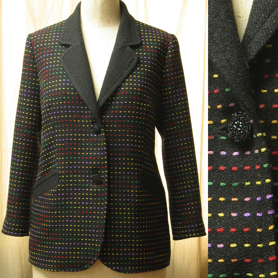 このジャケットの襟とポケットの部分は、身頃に用いた生地の色の織り糸を抜いて用いました。
