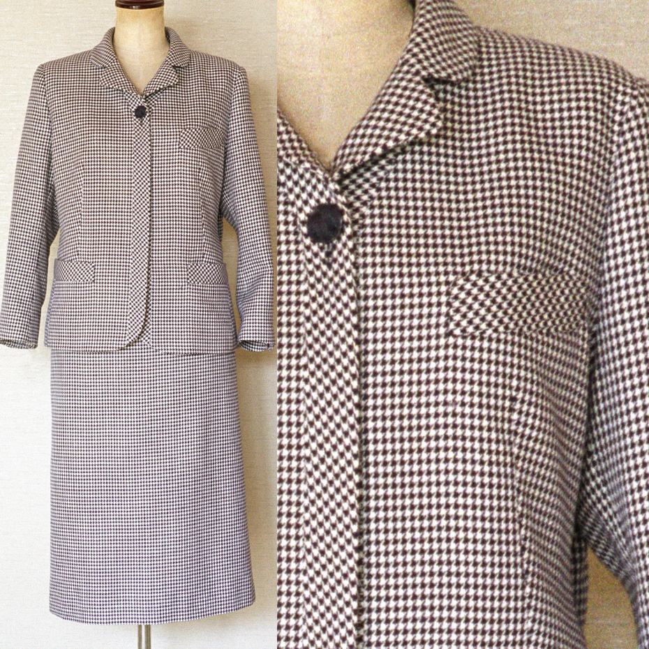 小さめの衿、箱ポケット、一つだけ見えるデザインのポイントとなるボタン、所どころに用いたバイヤス使いや、細かい箇所まで角をなくした仕立てによって、硬く見られがちな千鳥格子のウール地に、優しくやわらかな印象をもたらし、シンプルに端正に、スーツに仕立てました。