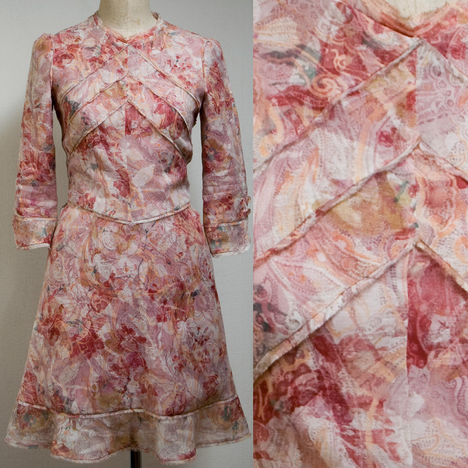 斜めに切り替えられたバストラインやウェスト切り替えなどに、バイアス生地をはさみ込みました。
