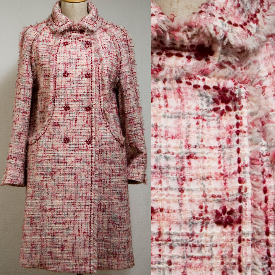 衿のカーブ、袖付けのカーブ、前身頃の切り替えからポケットにいたるカーブを、互いに調和させるようデザインをしたスプリングコートは、衿や、前端や、切り替え線にフリンジをはさみ込み、赤い毛糸のハンドステッチをアクセントにして、さらにスナップにも毛糸で飾り付けました。