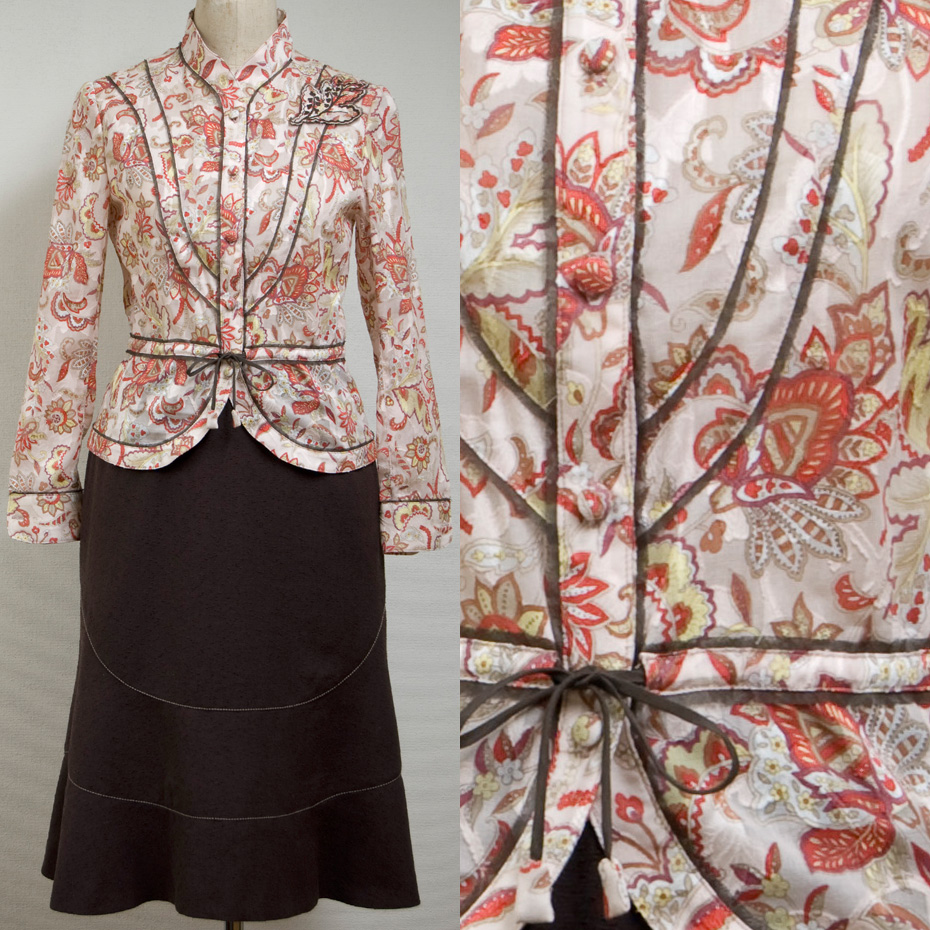 スタンドカラーとつながった、前端から裾へと曲線を描く切り替え。