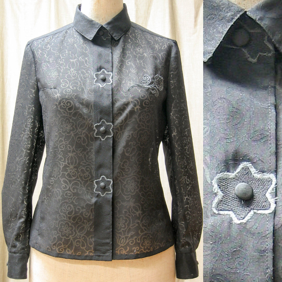 このブラウスは、その方法を用い、さらに刺繍をする段階で、生地の上にグレーのオーガンジーをあてて刺繍を施し、後で切り抜いてフリンジにしました。