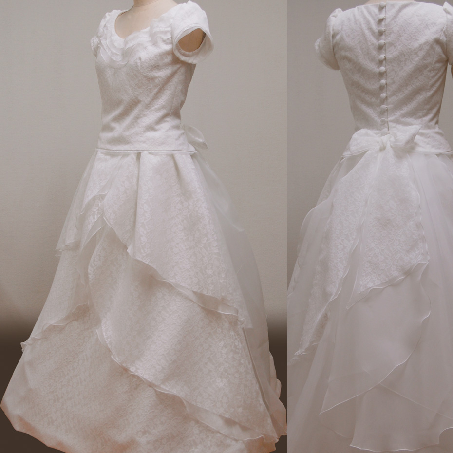 この、レースとオーガンジーを複雑に組み合わせたウェディングドレスは、フリル使いやリボンなどをあしらうことによって、大人の可愛らしさを演出してくれます。