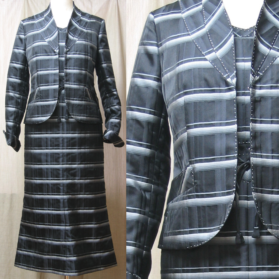 一見シンプルでも、ストライプの柄が複雑に構成されたアンサンブル。