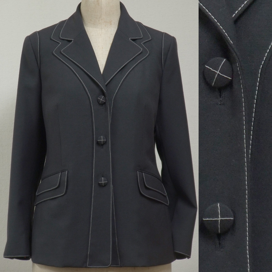 オーソドックスなグレーのウール生地に、ちょっと複雑なデザインを施し、遠目にはシンプルにも見えるデザインの中に、細部のテクニックによって華やかさを演出したジャケットです。