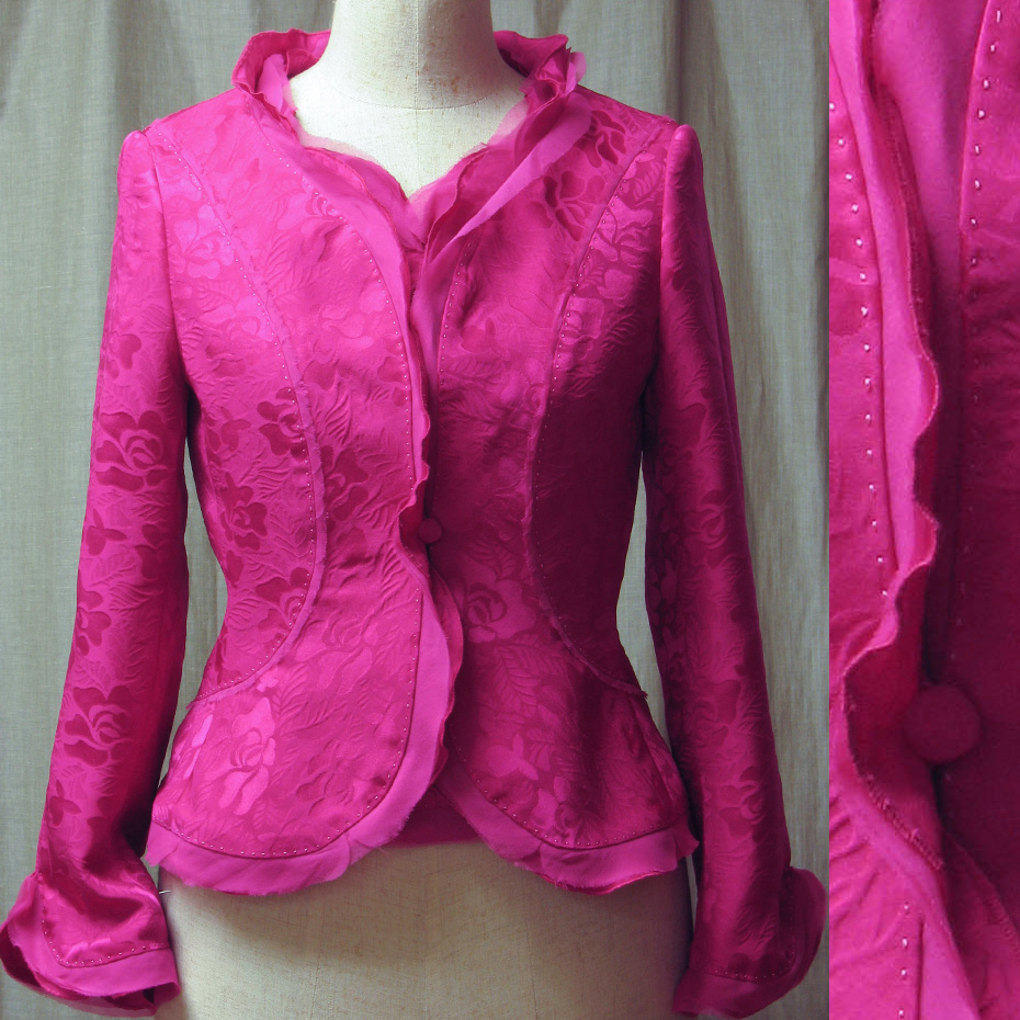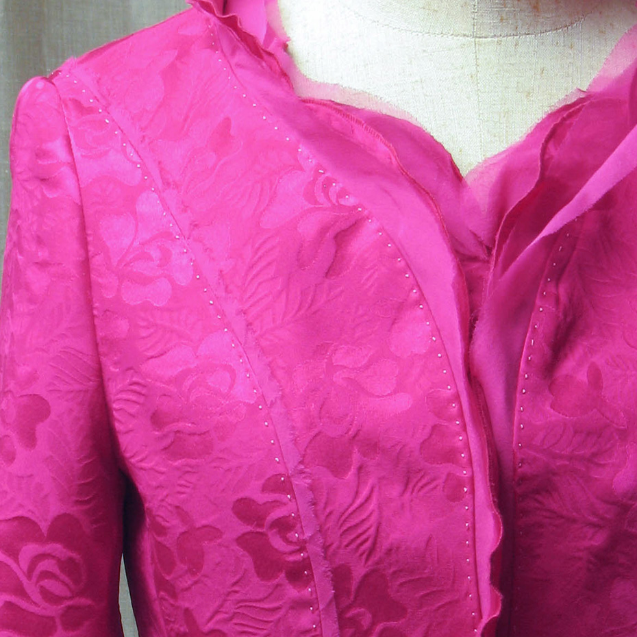 バラの模様のジャガード織りのシルク地と、同色のシルクシフォンを組み合わせた、ジャケット・アンサンブル。