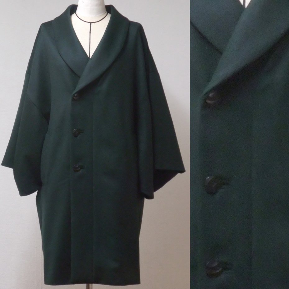 この着物用のカシミヤ生地のコートは、前中心の切り替え線からショールカラーに至る、流れるようなラインが特長です。