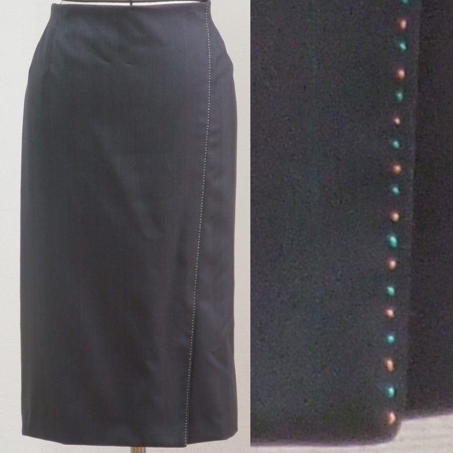 写真のグレーのスカート、生地に細い赤系と緑系のストライプが交互に入っているのですが、その2色に合わせて、ベンツを兼ねた左前身頃の斜めの切り替えの部分に、交互に2色のハンドステッチを施しました。