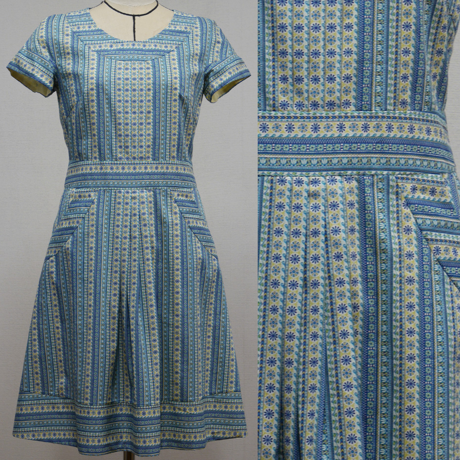 部分部分の生地を90度回転させて、縦方向と横方向のストライプを混ぜ合わせ、前身頃は、特定のプリント部分のみが現れるように畳み込み、中心部分に違った生地を使ったようにも見える、この生地だからこそ成立したであろうデザインです。