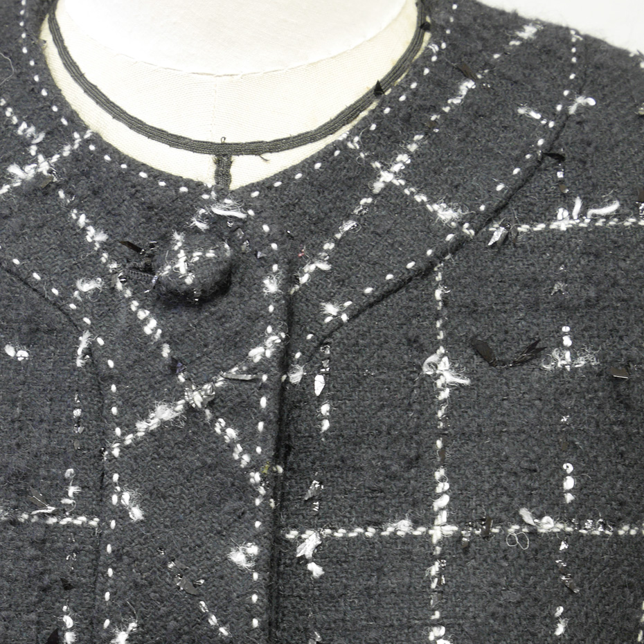 見頃と袖はオーソドックスに縦地、襟ぐりから前端、ポケットと袖口はバイアス。