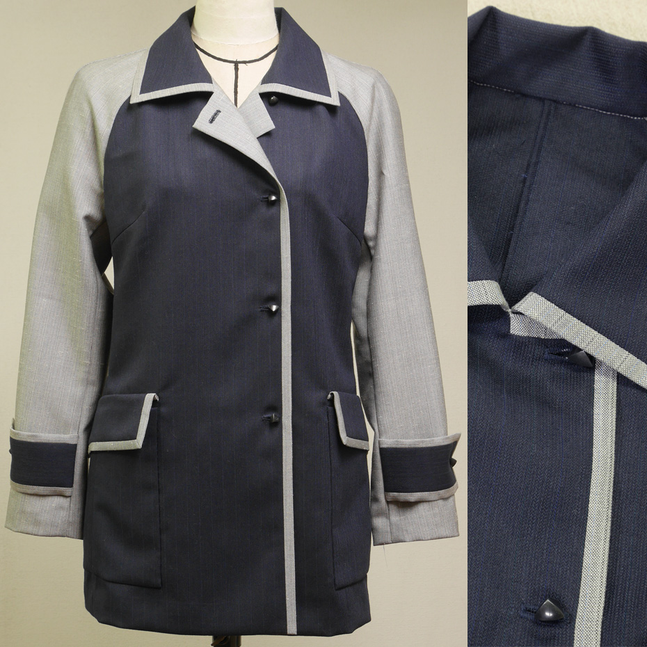 着なくなった紳士服スーツ2着を、一度バラバラにしてから組み合わせてリメイク。女性用のジャケットに仕上げました。