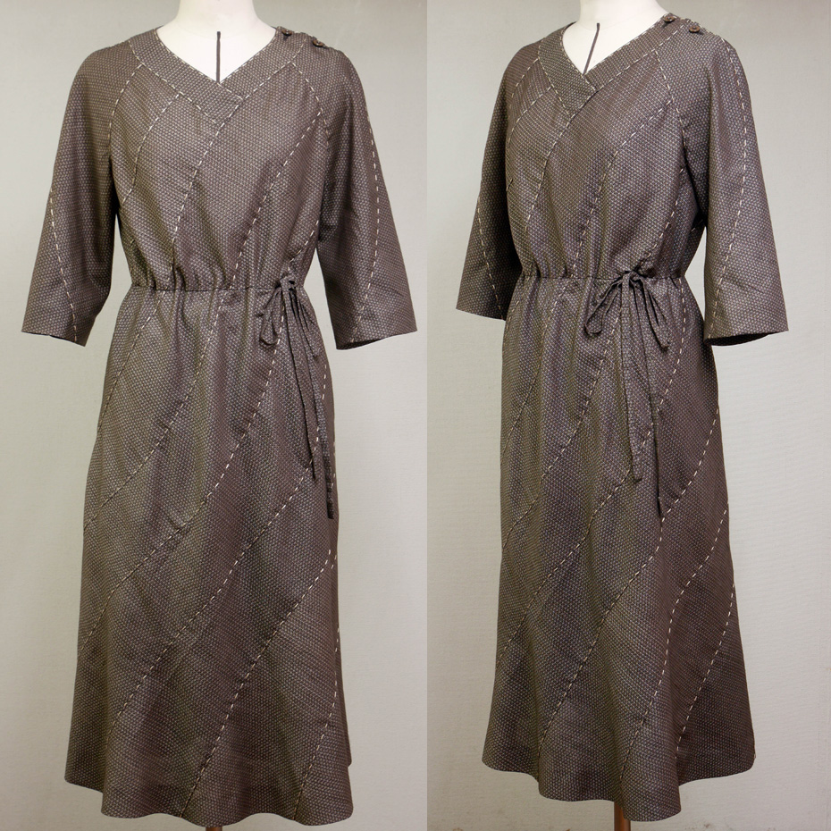細く裁断した生地の部品を斜めに縫い合わせた、スパイラル状の切り替え線がポイントのワンピース。
