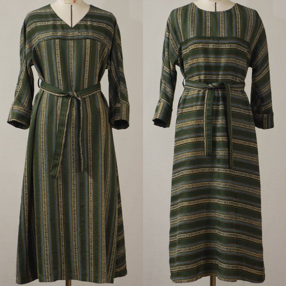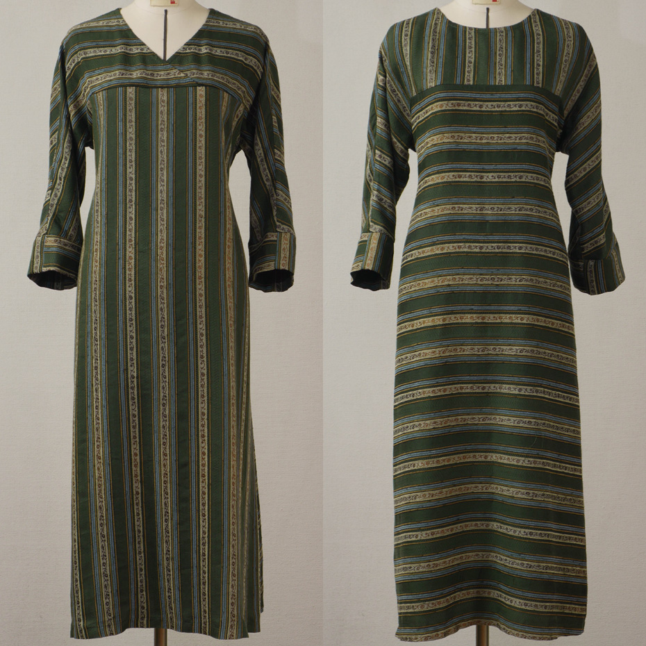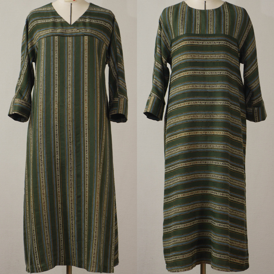 ジャガード織りのストライプの生地を、縦横に組み合わせて、前後どちらでも着ることができ、それぞれ違った表情が楽しめる、ワンピースドレスです。