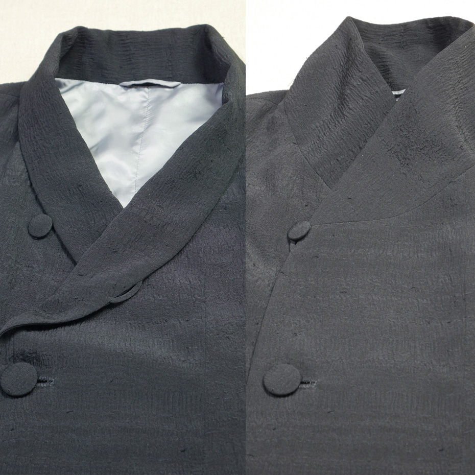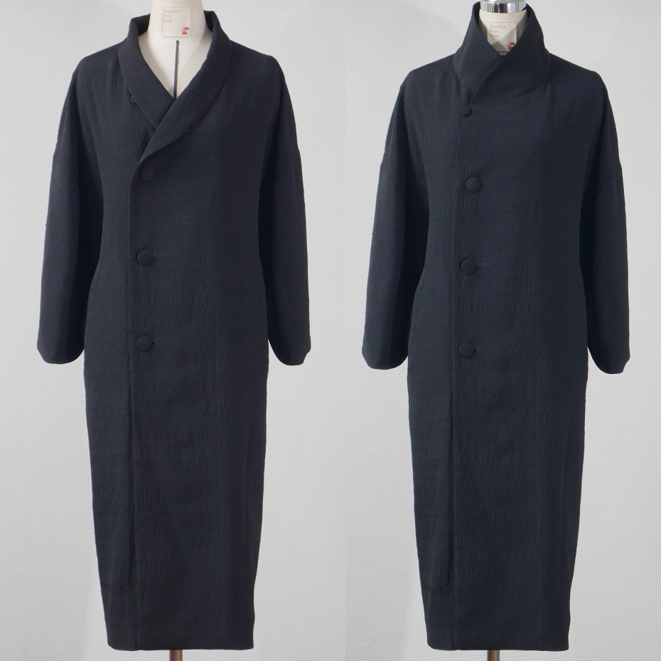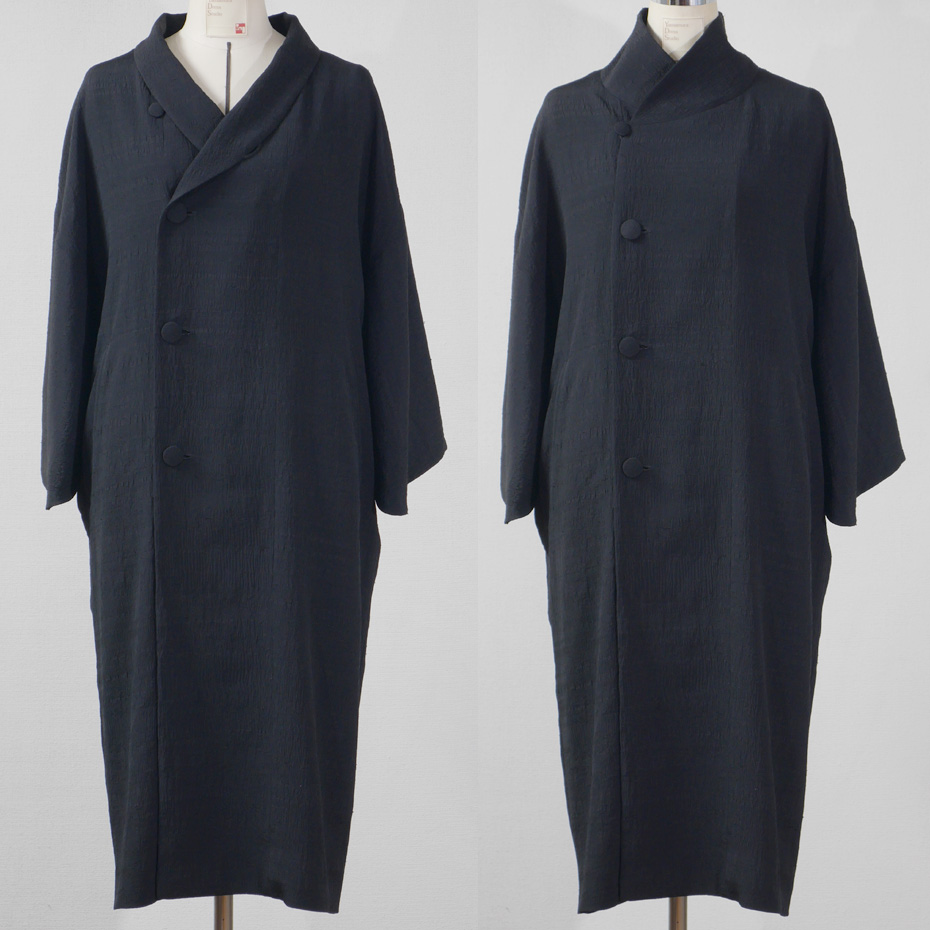 襟を折り返しても立てても着られ、「着物」とも「洋服」ともコーディネートのできるコートは、あらゆる着方に対応できるよう、シンプルなデザインに、袖の幅や、襟のバランスなどに、最心の注意が払われています。