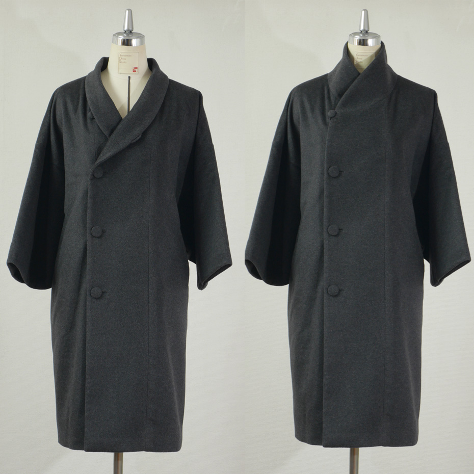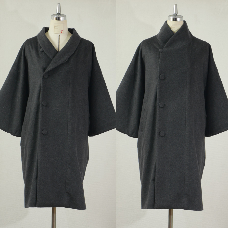 襟を折り返しても立てても着られ、「着物」とも「洋服」ともコーディネートのできるコートは、あらゆる着方に対応できるよう、シンプルなデザインに、袖の幅や、襟のバランスなどに、最心の注意が払われています。