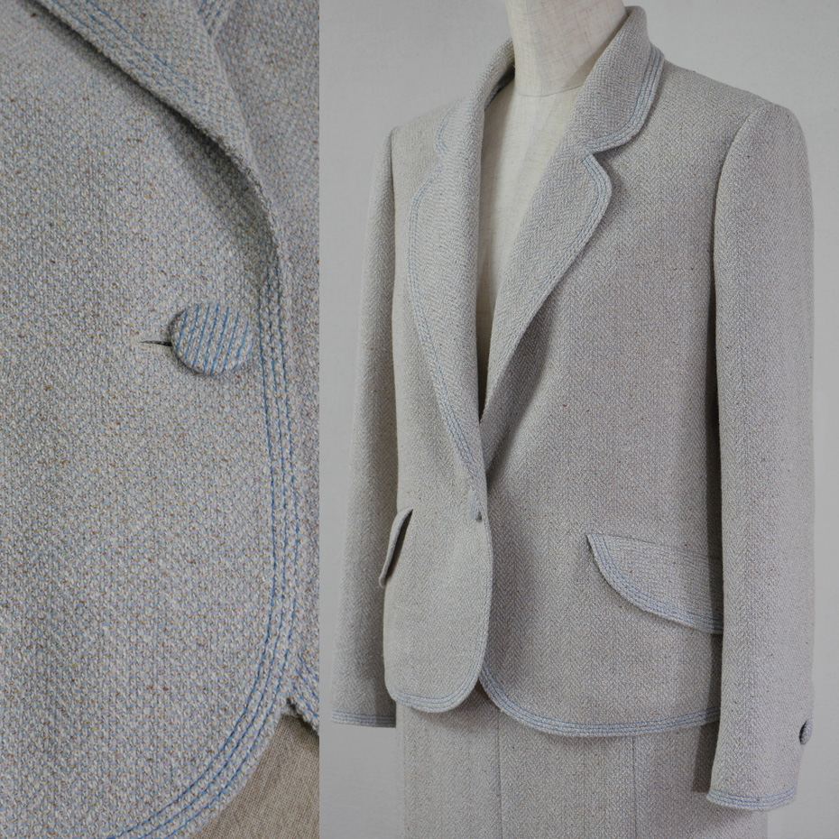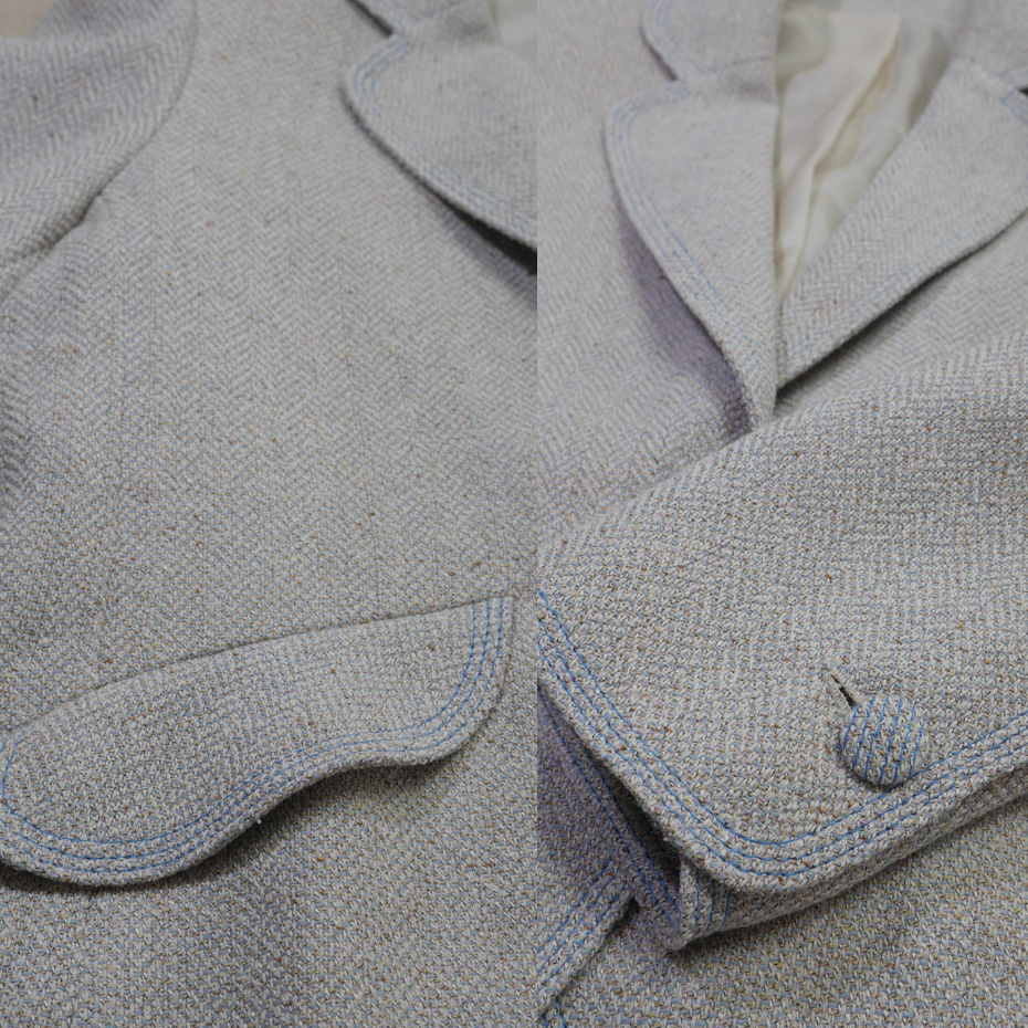 ゆるやかで優しいカーブを描く襟や袖口、ポケットのフラップはほんの少しフレアーを入れ、濃い目の水色の三本ステッチをかけて、クルミボタンにも、同じステッチをほどこしました。