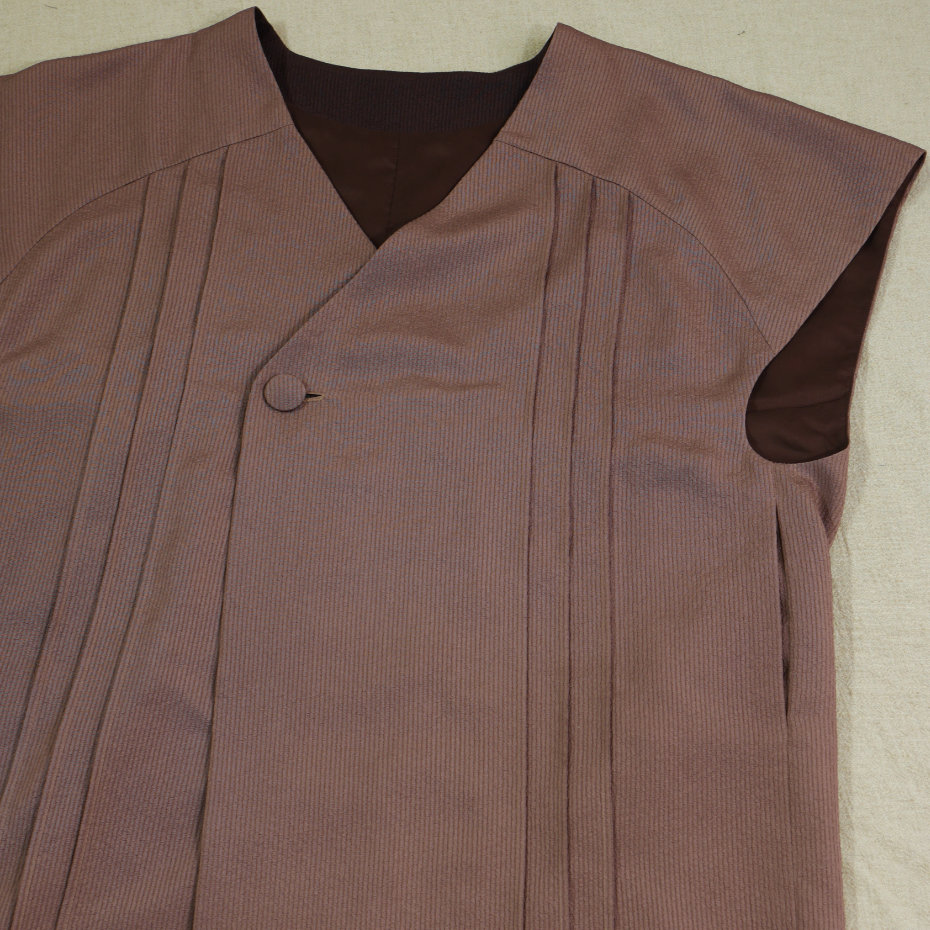 今回のベストは、ピンタックによる幅の消費分を含め、生地幅いっぱいで前後の身頃部分を構成し、構造上幅の足らなくなる袖口の部分を、斜めの曲線で切り替ることによって、デザインと生地を極力無駄にしないことの両立をはかりました。