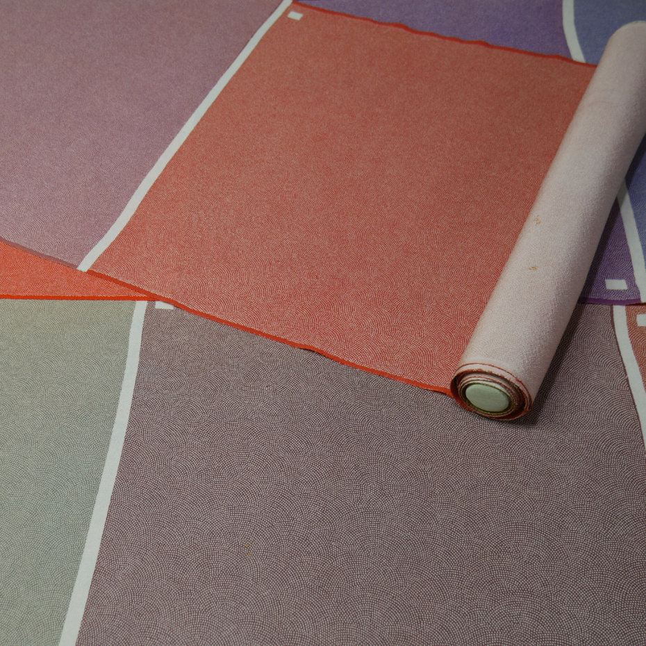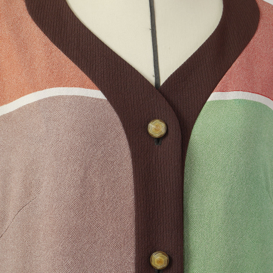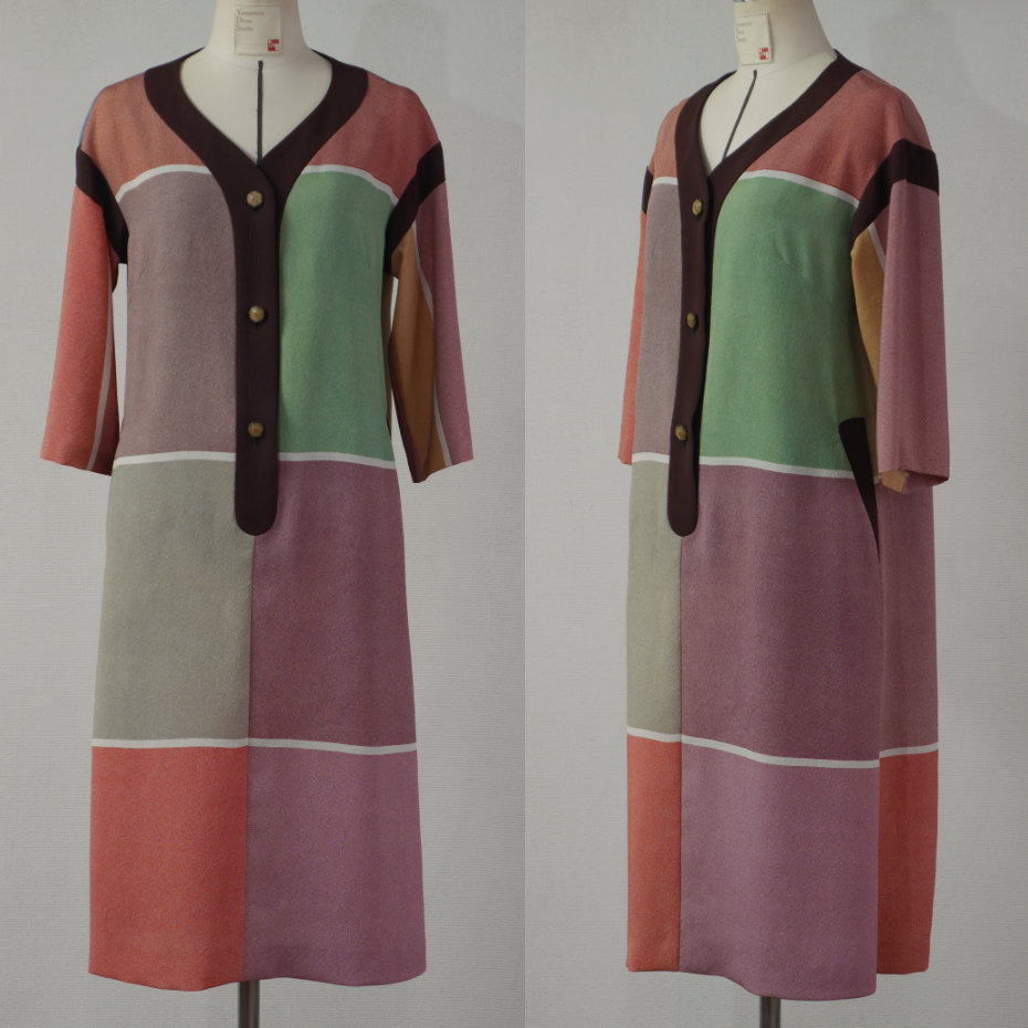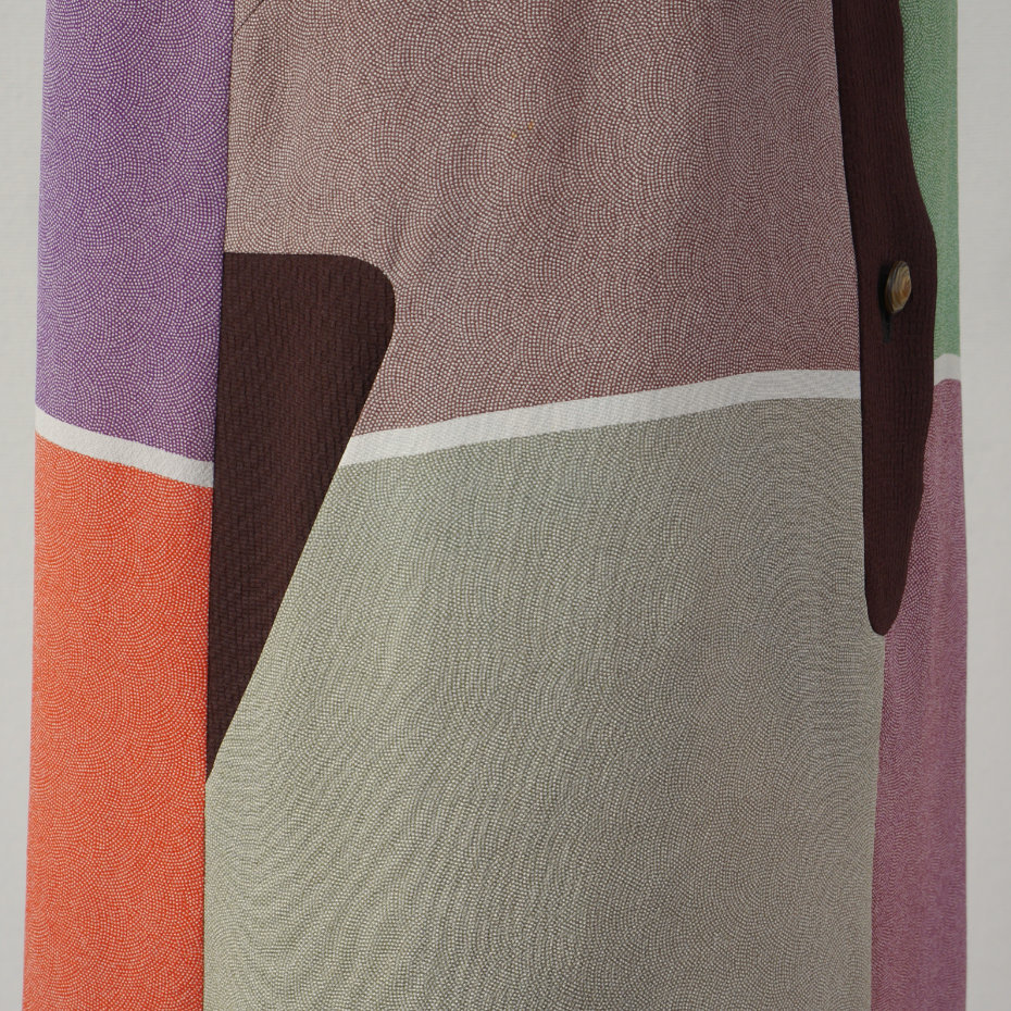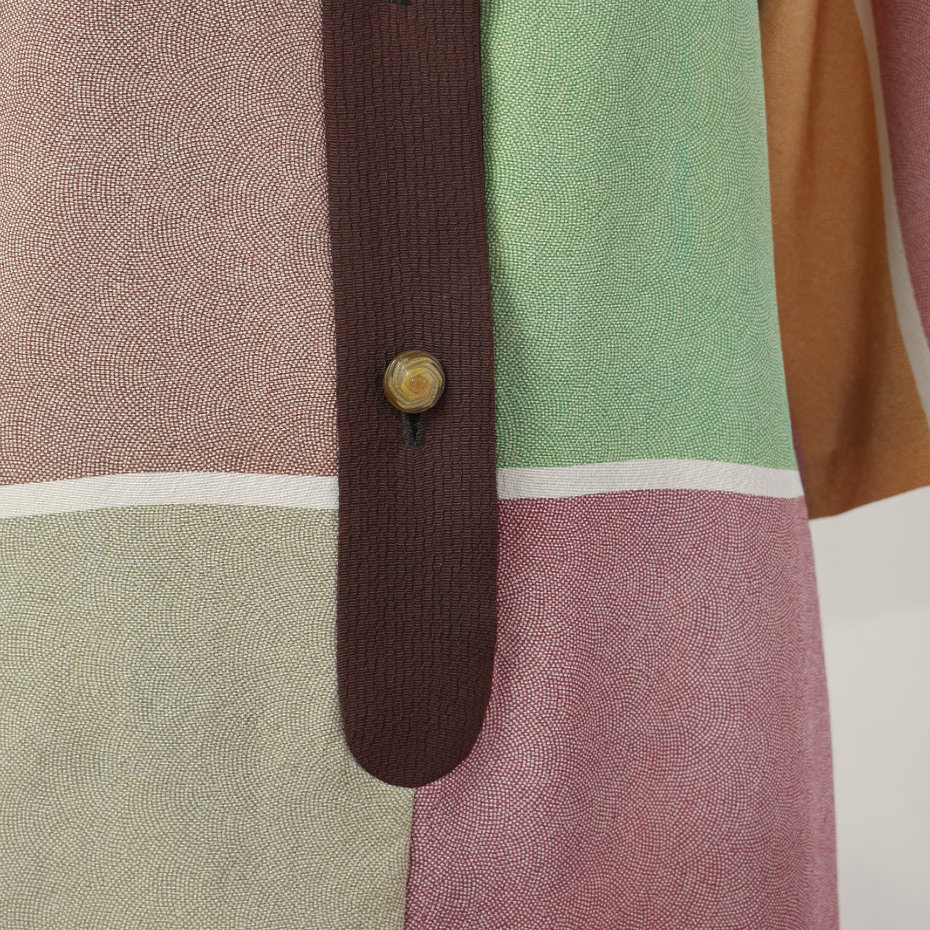 約30cmごとに異なる色に染められた「小紋」の見本着物生地をそのまま使い、シンプルなAラインのワンピースに仕立てました。