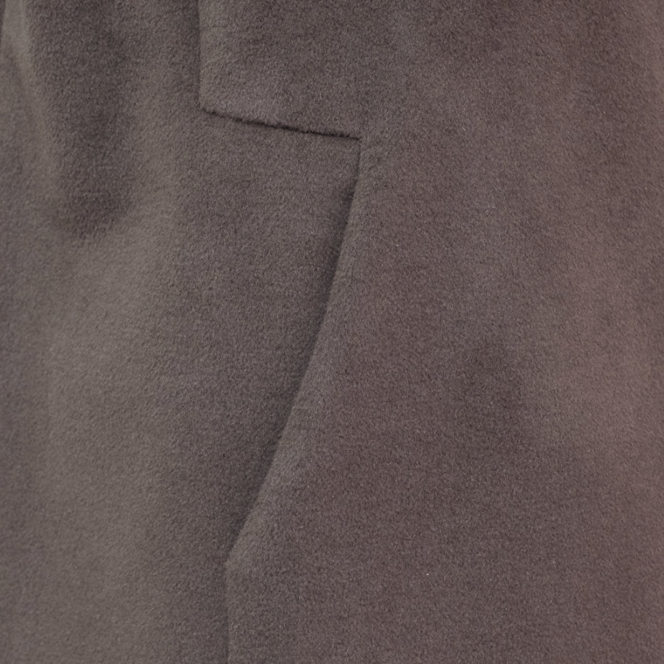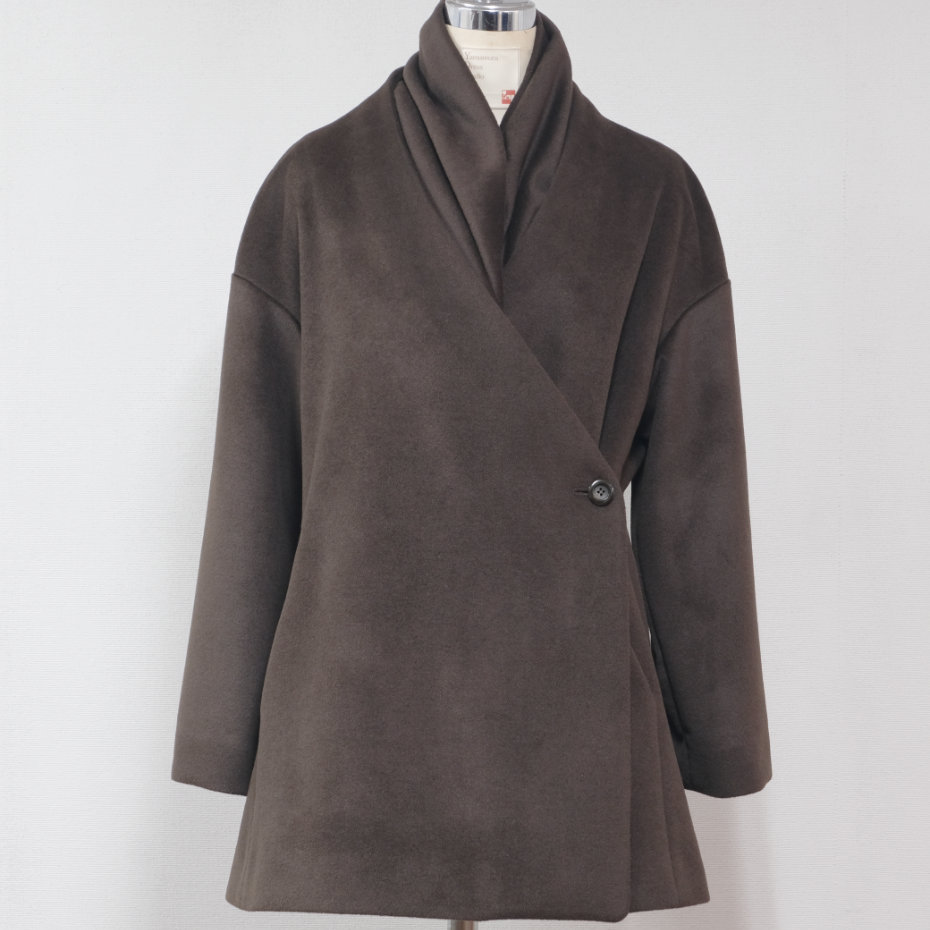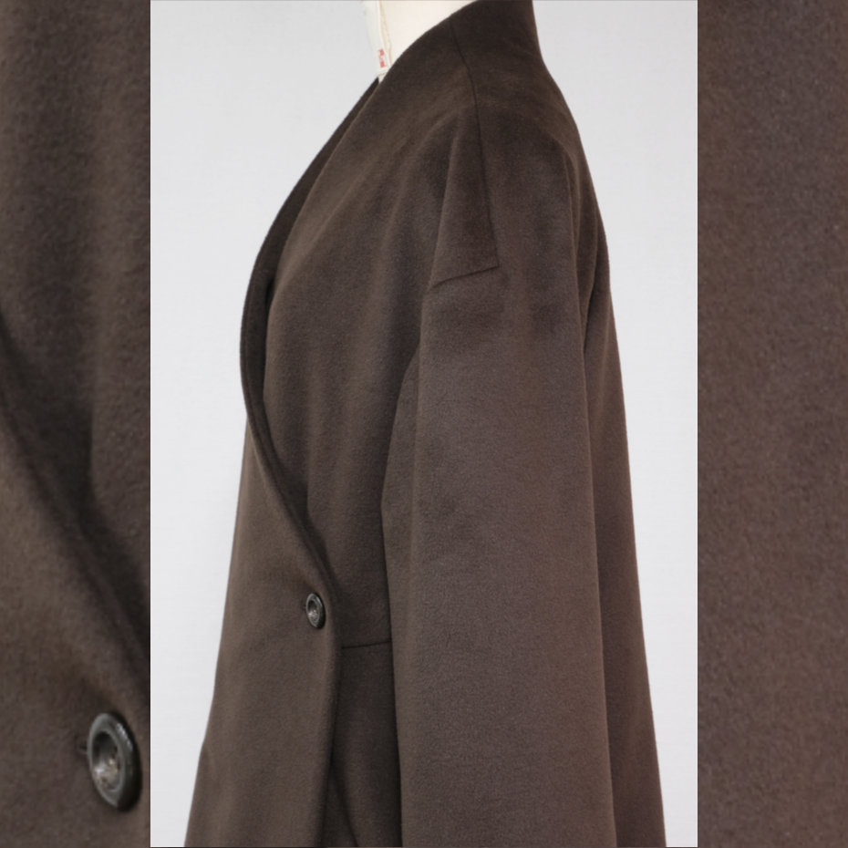 このコートをご注文いただいた時、最高級のカシミヤ生地とともに、お客様からの最初のご要望は「70〜73センチくらいのコートとしては短めの丈、打ち合わせの深い(前身頃の重なっている部分が広い)コート」というもので、その後のお話の中で、「襟はない」「襟腰の高さはある(後ろから見て、首が隠れる)」デザイン、ということになりました。