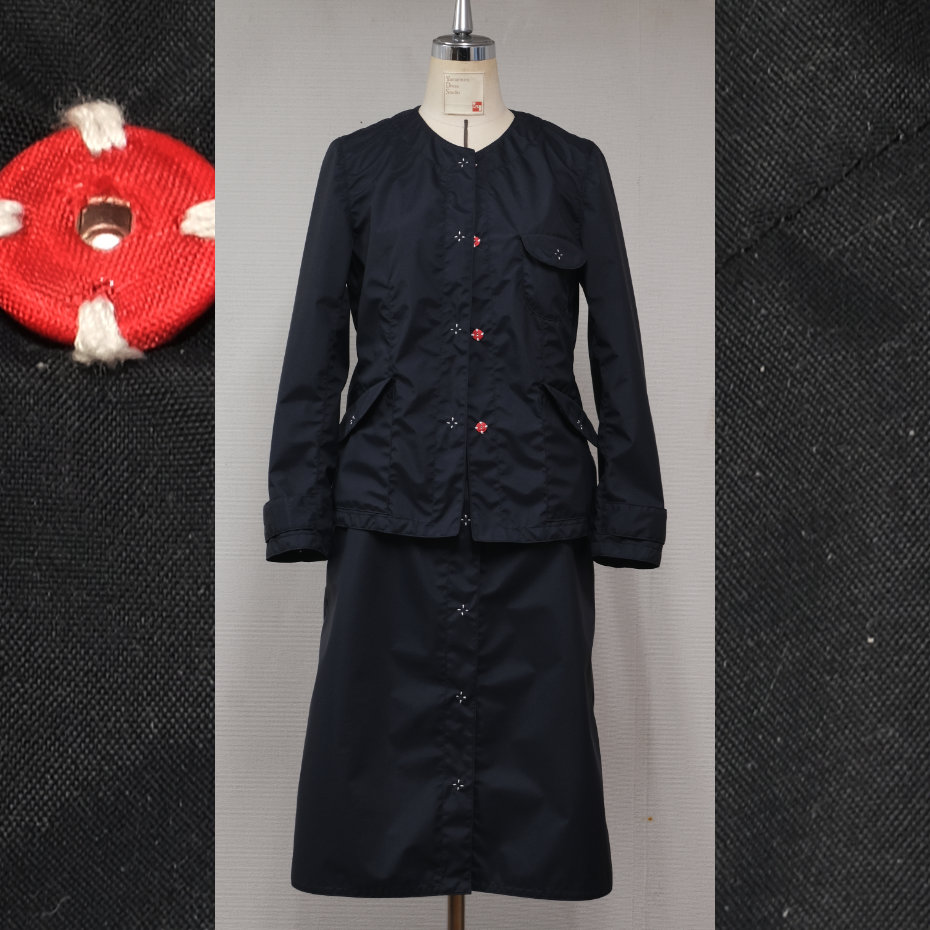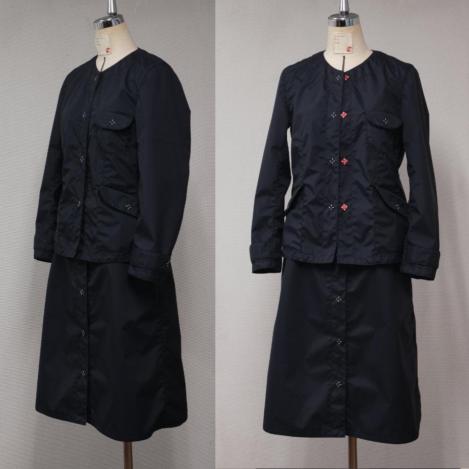 このスーツは、これらの条件からデザインしたもので、両手の操作を必要とする、ボタンやオープンファスナーではなく、スナップやカギホックを用い、同時に、赤いスナップと白い糸にすることで、デザインのポイントとしました。