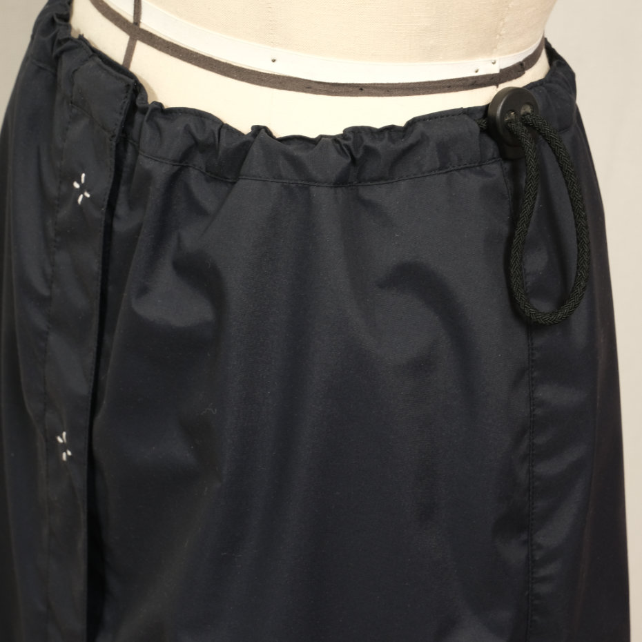 スカートの機能としては、中に履く様々なスカートやパンツにフレキシブルに対応させるため、ウェストサイズを調整可能にする必要があり、左側にアジャスターを付け、事前にウェストサイズを調整してから、脱ぎ着ができる仕掛けです。