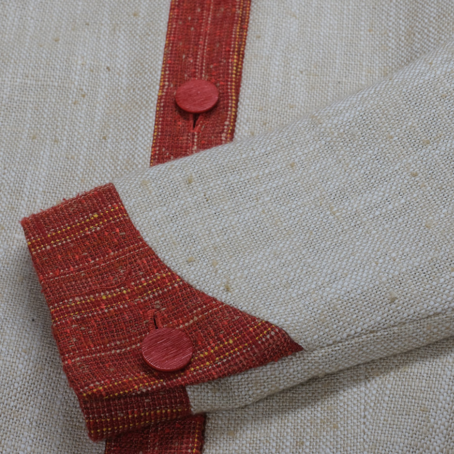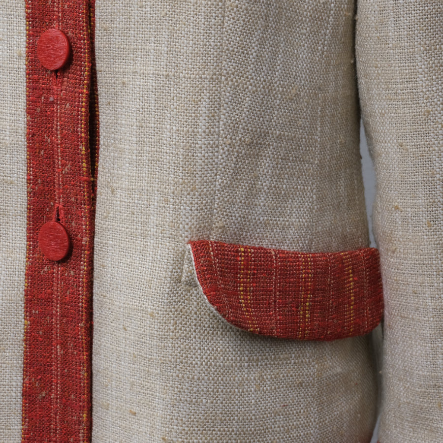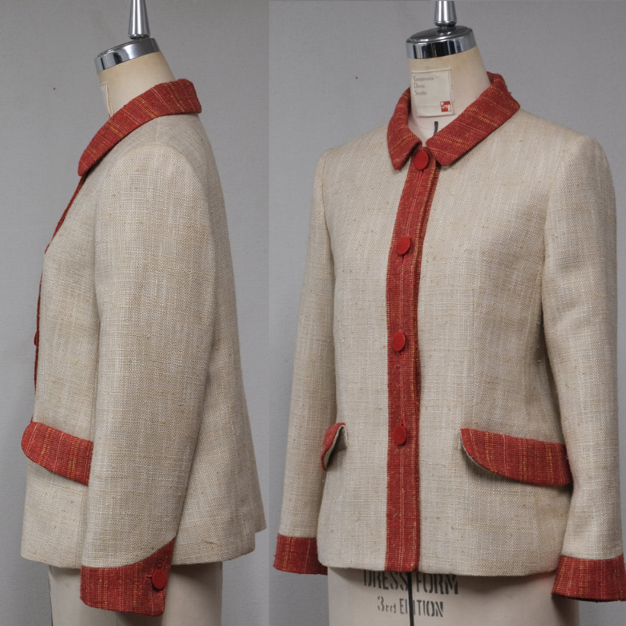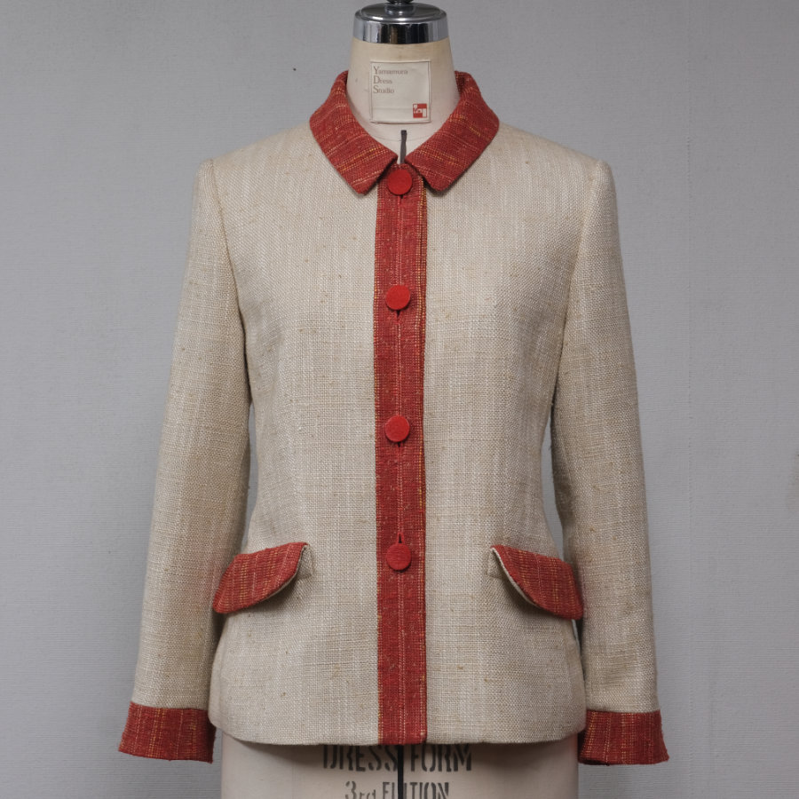 シルク素材のオレンジ色とベージュを組み合わせたジャケットは、シンプルな形の中に、繊細なこだわりを詰め込みました。