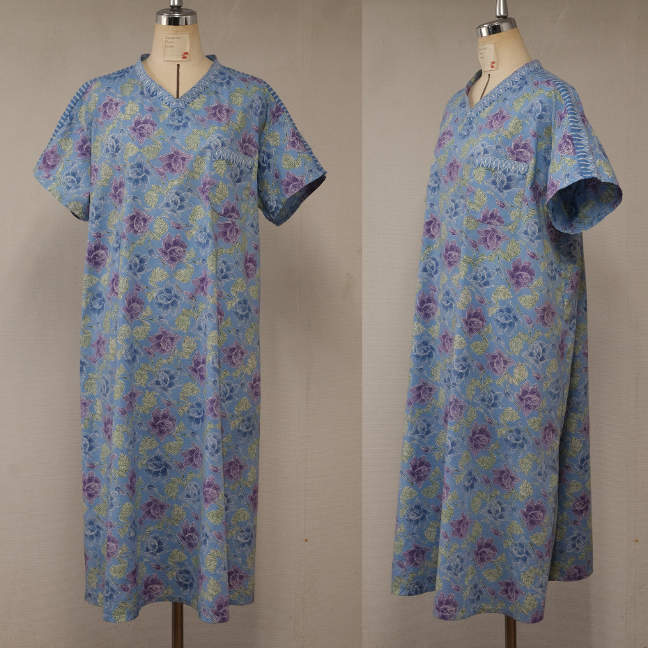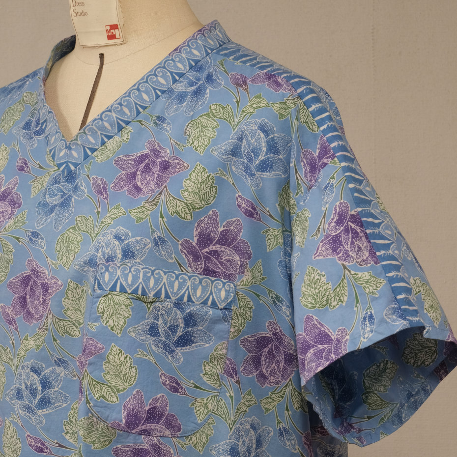 生地の両端にあった異なるプリントの部分を、襟ぐり、肩、ポケットのアクセントにしました。