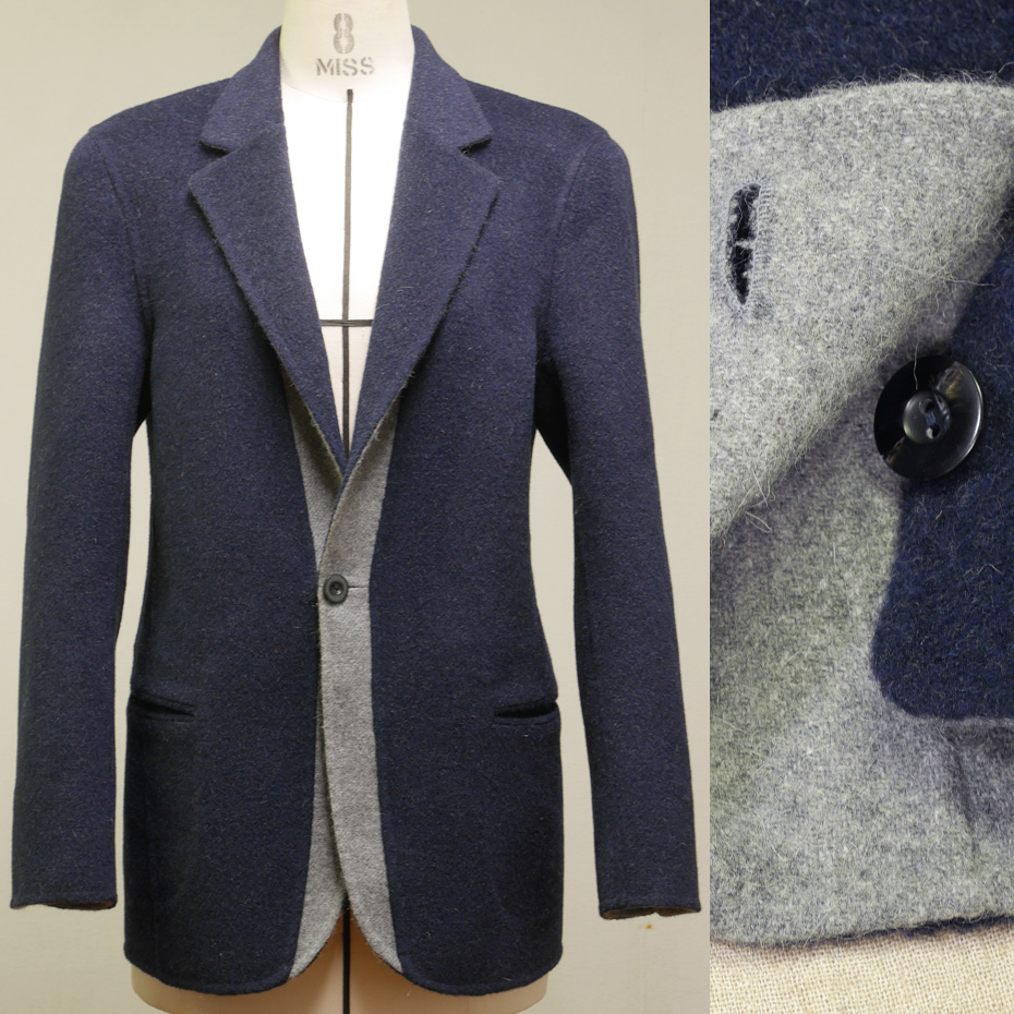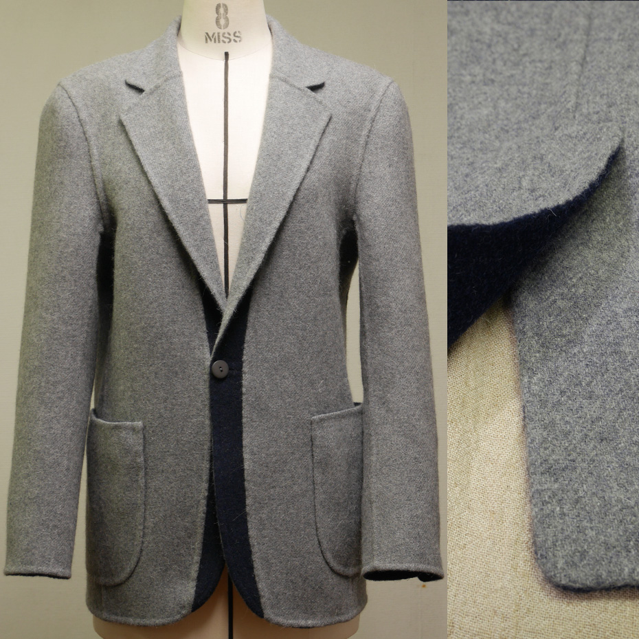 リバーシブル(ダブルフェイス)仕立ての服自体があまり多くはなくて、構造上は裏返しても着られる服は、さらに少ないと思いますが、このジャケットはリバーシブルで着られるようにしました。