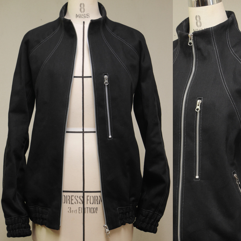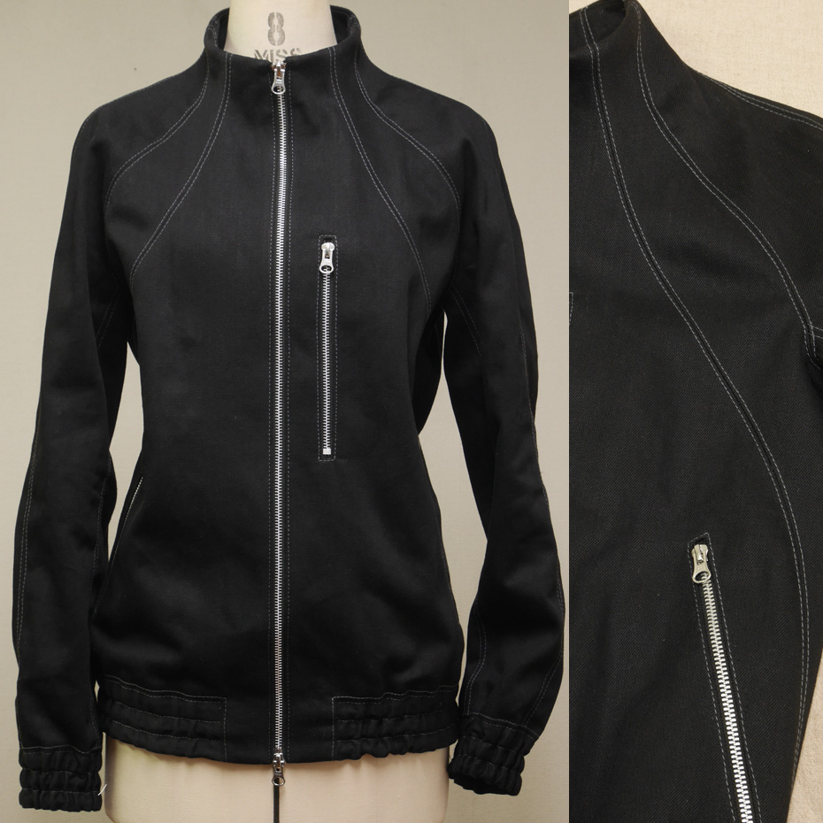 シンプルな形に、複雑な型紙で構成された、デニム生地のブルゾン 。