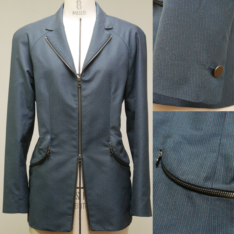 ボタン代わりの前身頃のファスナーにラグランスリーブと、スポーツウェアに使われそうな要素を取り入れ、ファスナーを付け、カーブした立体的なポケットが特長です。