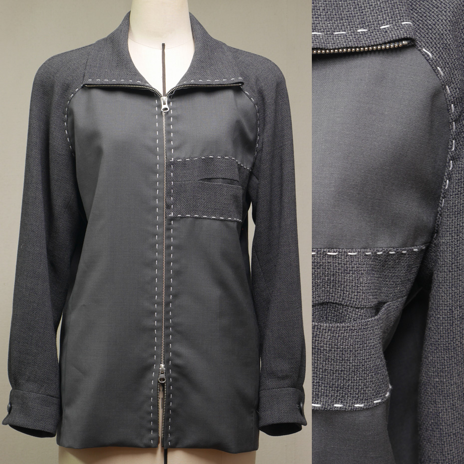 ファスナー使いや、ハンドステッチを活かした、カジュアルなイメージの紳士服ジャケットの生地は、二着の紳士服スーツを解体したリメイクです。