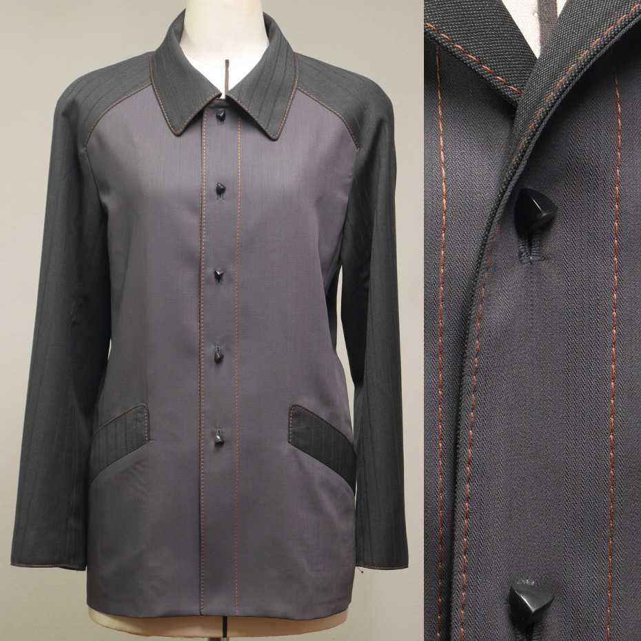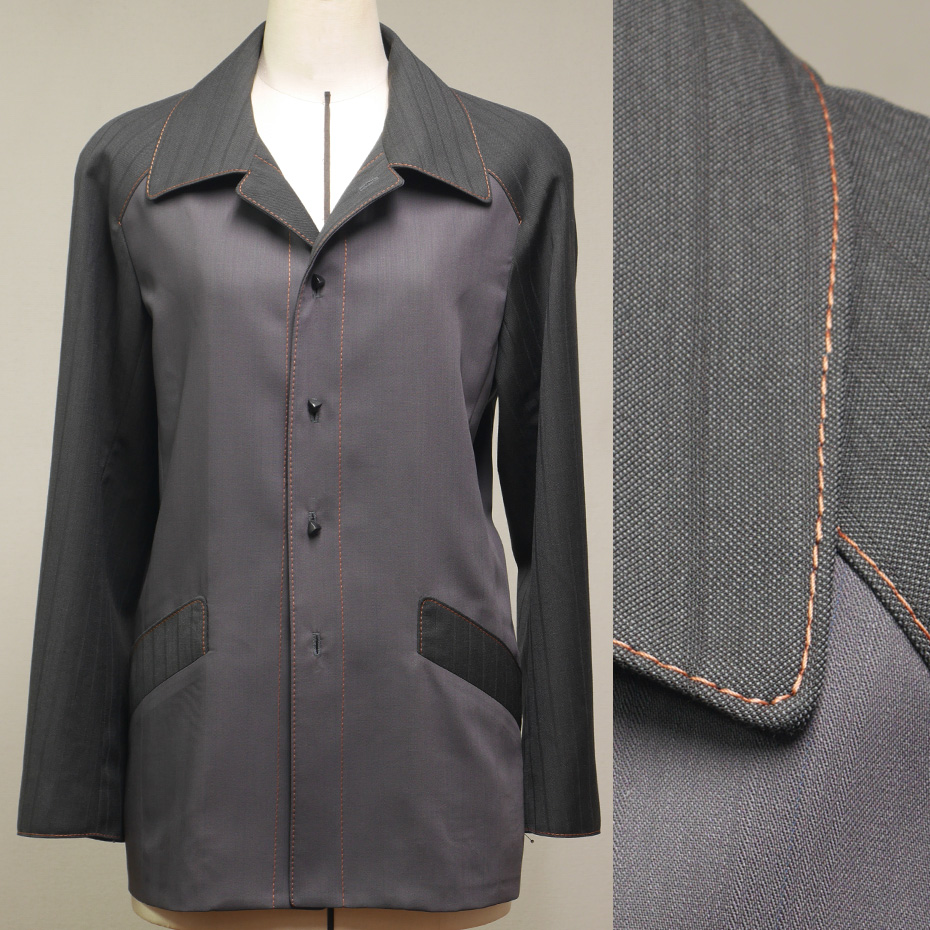 茶色のステッチを活かした、紳士服ジャケットの生地は、二着の紳士服スーツを解体したリメイクです。
