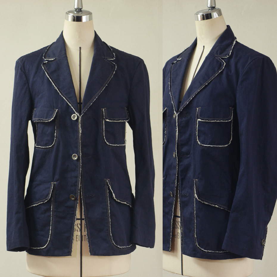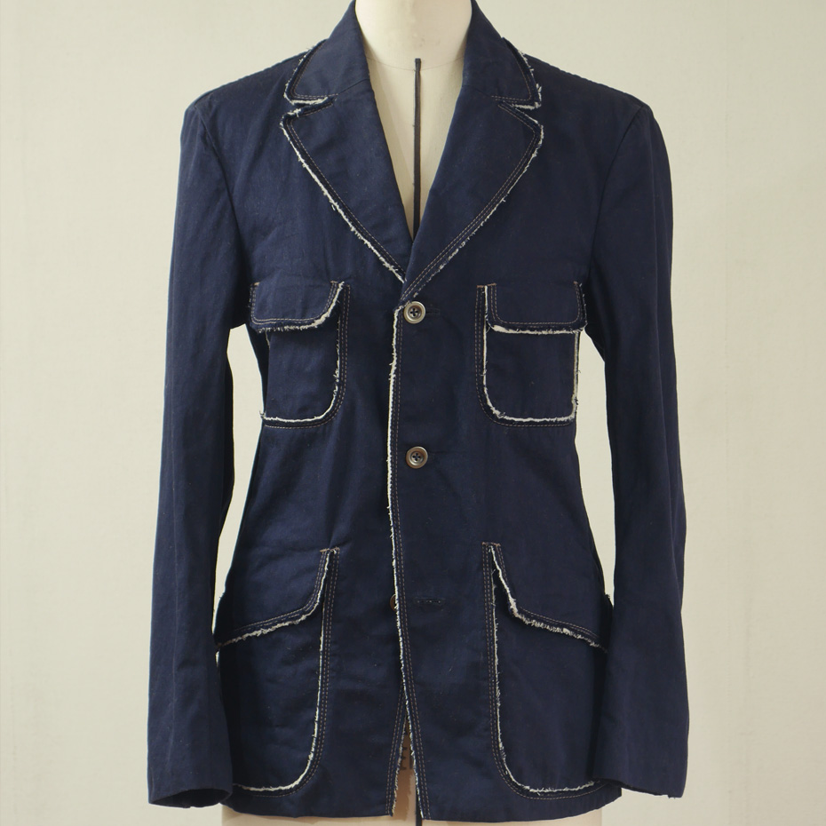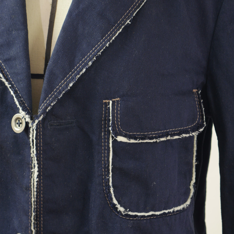 シーチング(トワル生地)を綿デニムの生地で挟んで、裁ち端から間に挟んだ生地が覗くようつくられたジャケットは、ちょっと変わった構造のポケットが特徴です。
